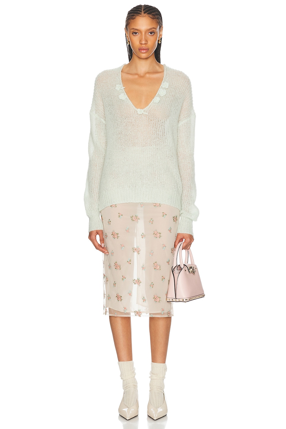 Искусственный жемчуг и объемный цветочный узор на вырезе