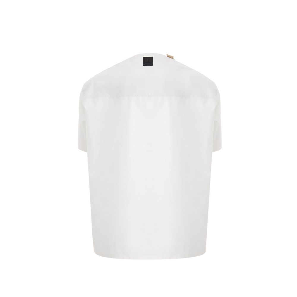 Свитер-туника Emporio Armani Over Tunic белого цвета с бежевой подкладкой, круглый вырез, широкий короткий рукав, застежка на скрытые кнопки на шее, небольшие разрезы по бокам, резиновый логотип на спине. Состав: 100% хлопок-Артикул внутри: 23MG138-142