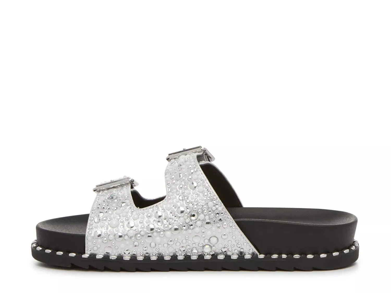 Простые стили все еще могут сверкать! Сандалии Cyraline от Джессики Симпсон отличаются спортивным дизайном скольжения в серебристом металлическом оттенке, украшенном сверкающими стразами и вставками с заклепками.