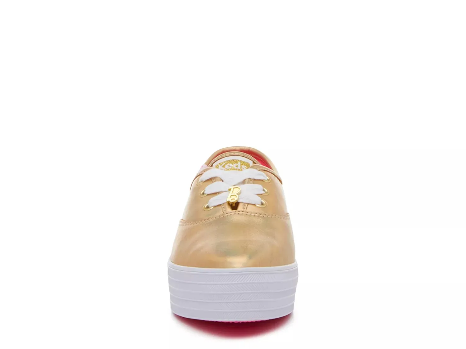 Украсьте свой повседневный образ с помощью кроссовок на платформе Barbie x Keds. Уникальный заостренный носок, шарм с логотипом золотого оттенка на шнурках и ярко-розовая подкладка для веселья.