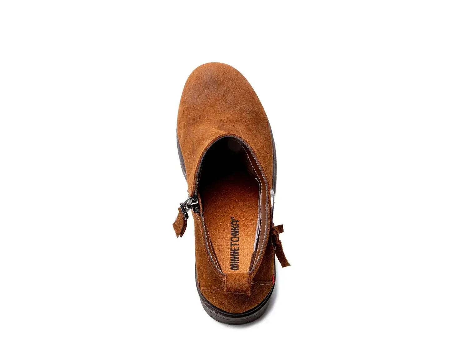 Универсальный стиль и утонченный вид ботильон Minnetonka Joyelle обязательно произведут на вас впечатление. Замшевый верх придает премиальный оттенок этим ботинкам, украшенным декоративными пуговицами и бантиками сбоку для создания очаровательного образа. Резиновая подошва имеет рисунок протектора, разработанный индейской художницей Ханной Стэндстронг для уникального прикосновения и улучшенного сцепления.