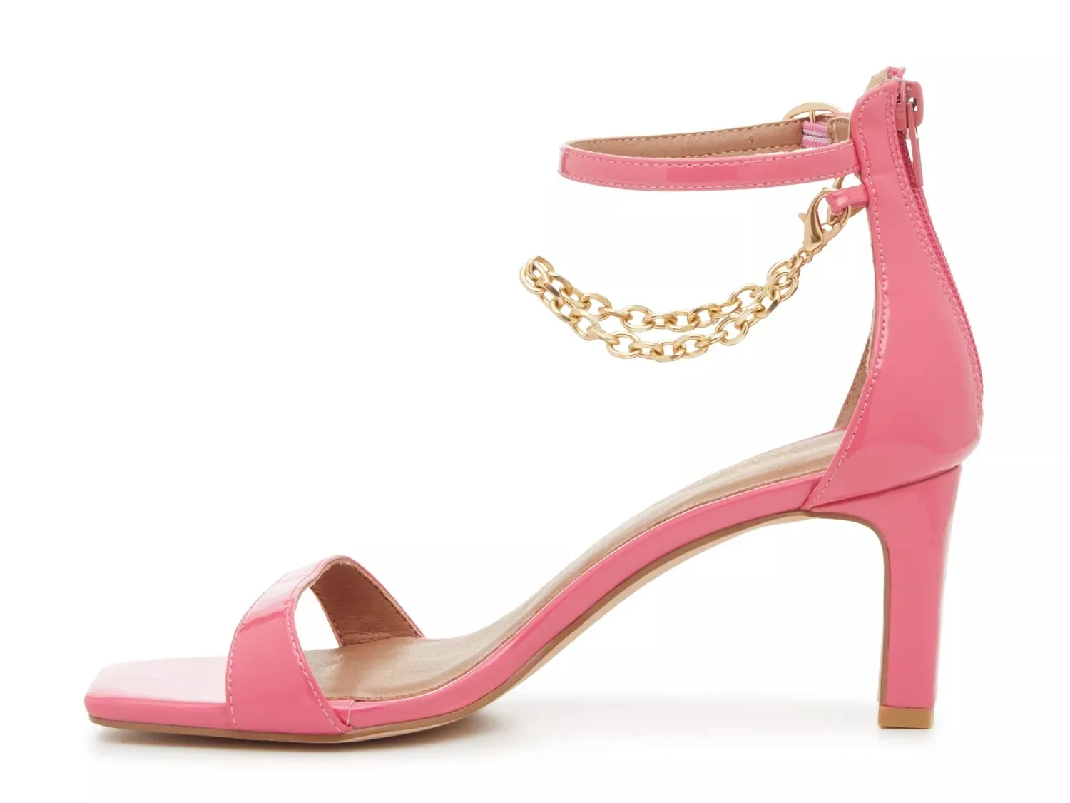 Деталь звеньев цепи золотистого тона, открытый силуэт, квадратный носок, каблук котенка