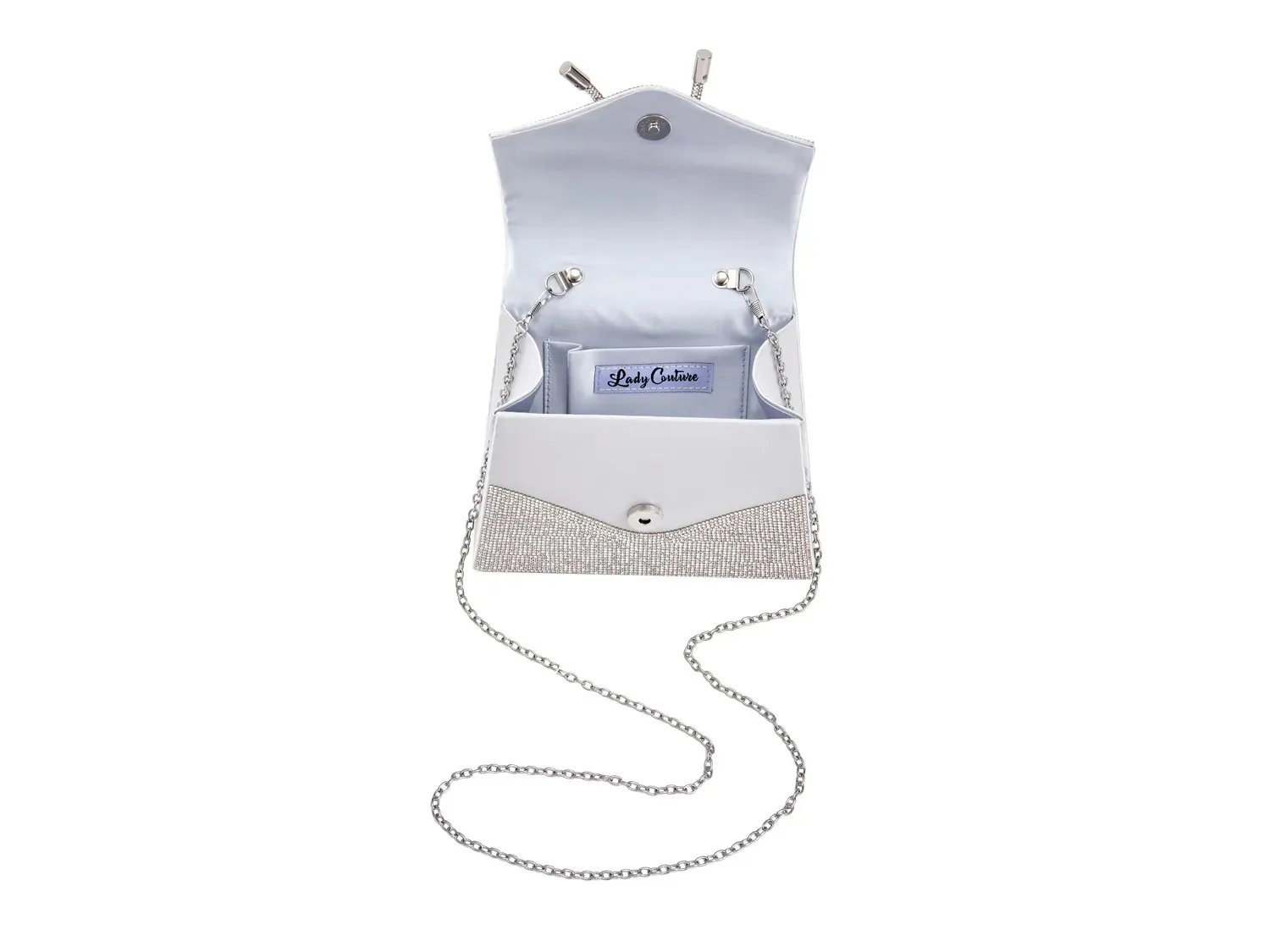 Благодаря мерцающей конструкции, покрытой стразами, и шикарному акценту в виде банта, клатч Celina от Lady Couture добавит привлекательности вашим вечерним образам. Застежка на кнопки обеспечивает безопасность предметов первой необходимости, а съемный плечевой ремень на цепочке позволяет носить одежду через плечо.