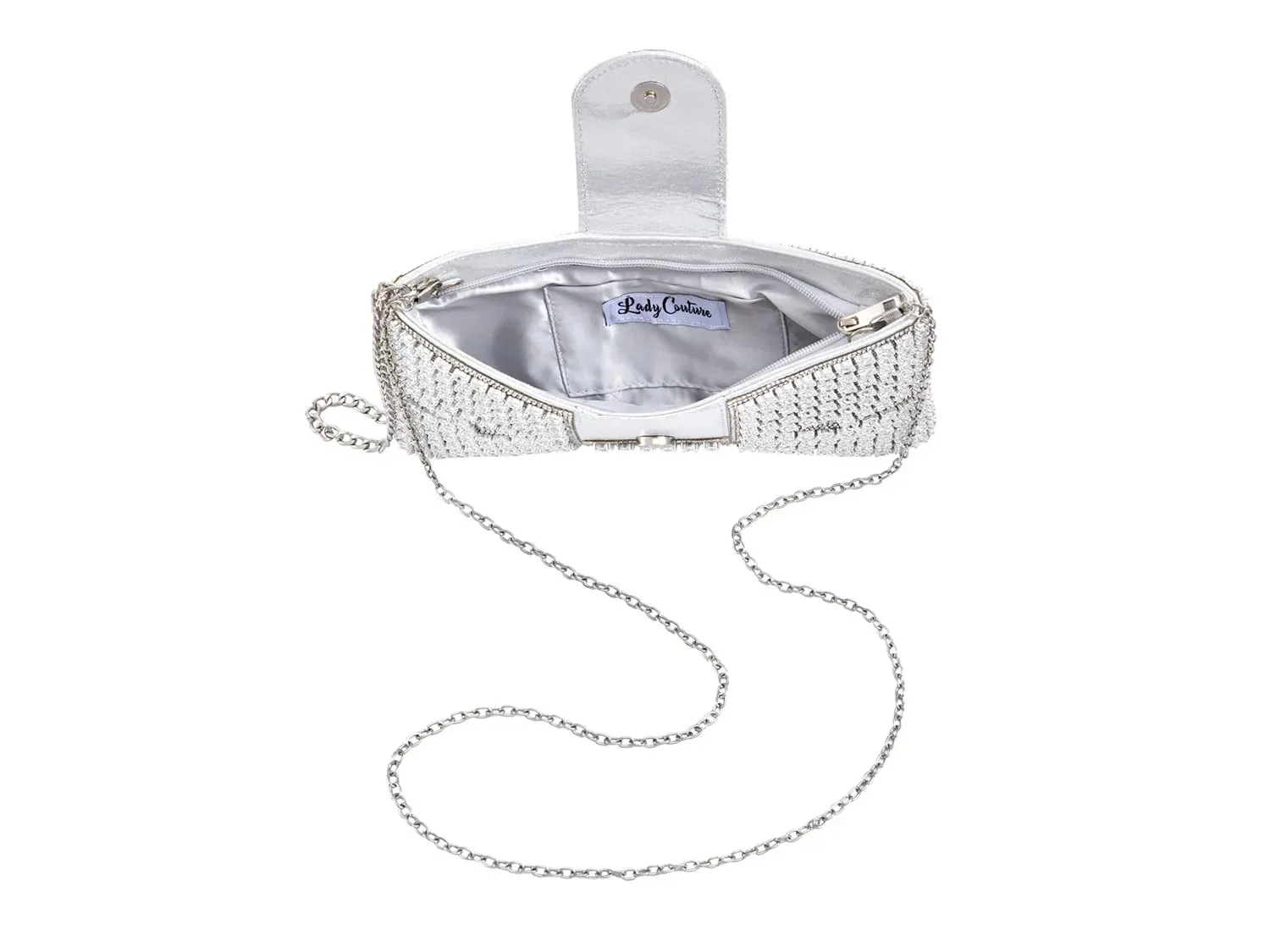 Сочетайте плющ от Lady Couture как клатч, браслет или сумку через плечо благодаря ремешкам-цепочкам. Эта сумка имеет силуэт оверсайз в форме банта, покрытый мерцающими стразами для дополнительного ослепления.