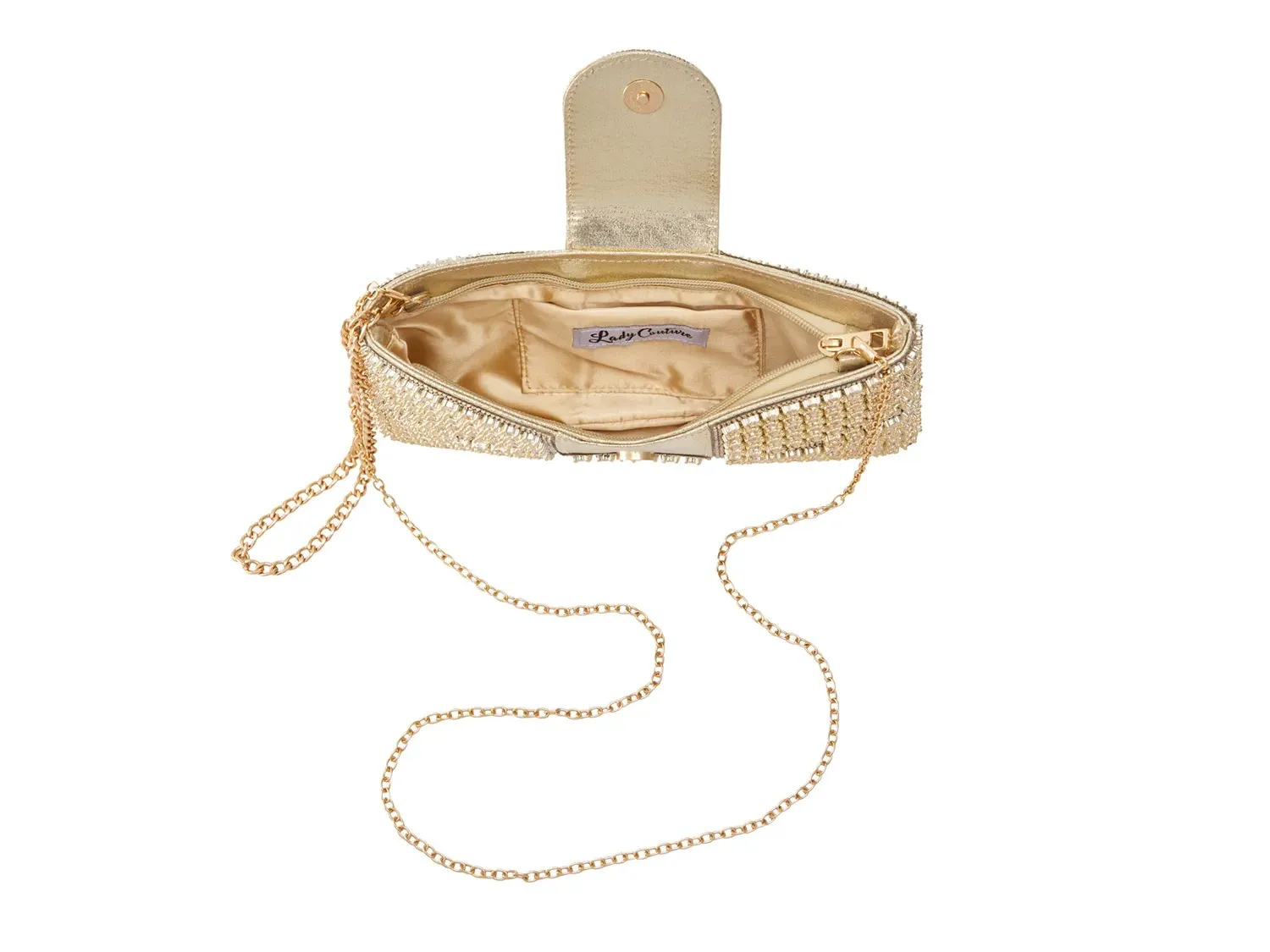 Сочетайте плющ от Lady Couture как клатч, браслет или сумку через плечо благодаря ремешкам-цепочкам. Эта сумка имеет силуэт оверсайз в форме банта, покрытый мерцающими стразами для дополнительного ослепления.