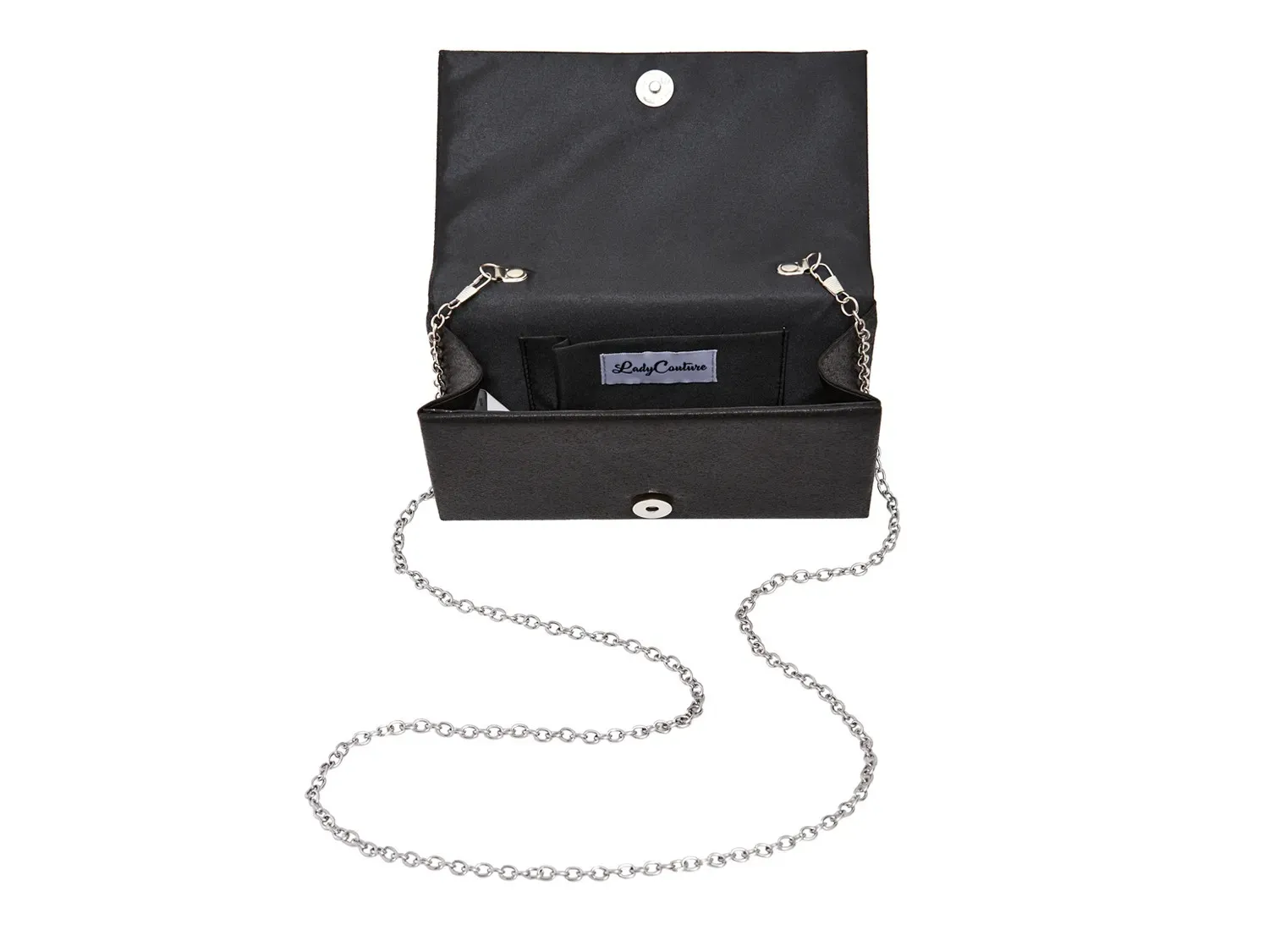 Добавьте блеска в любой наряд с помощью клатча Sue от Lady Couture. Атлас, украшенный стразами, добавляет блеска, а съемный ремешок-цепочка позволяет носить рок-боди!