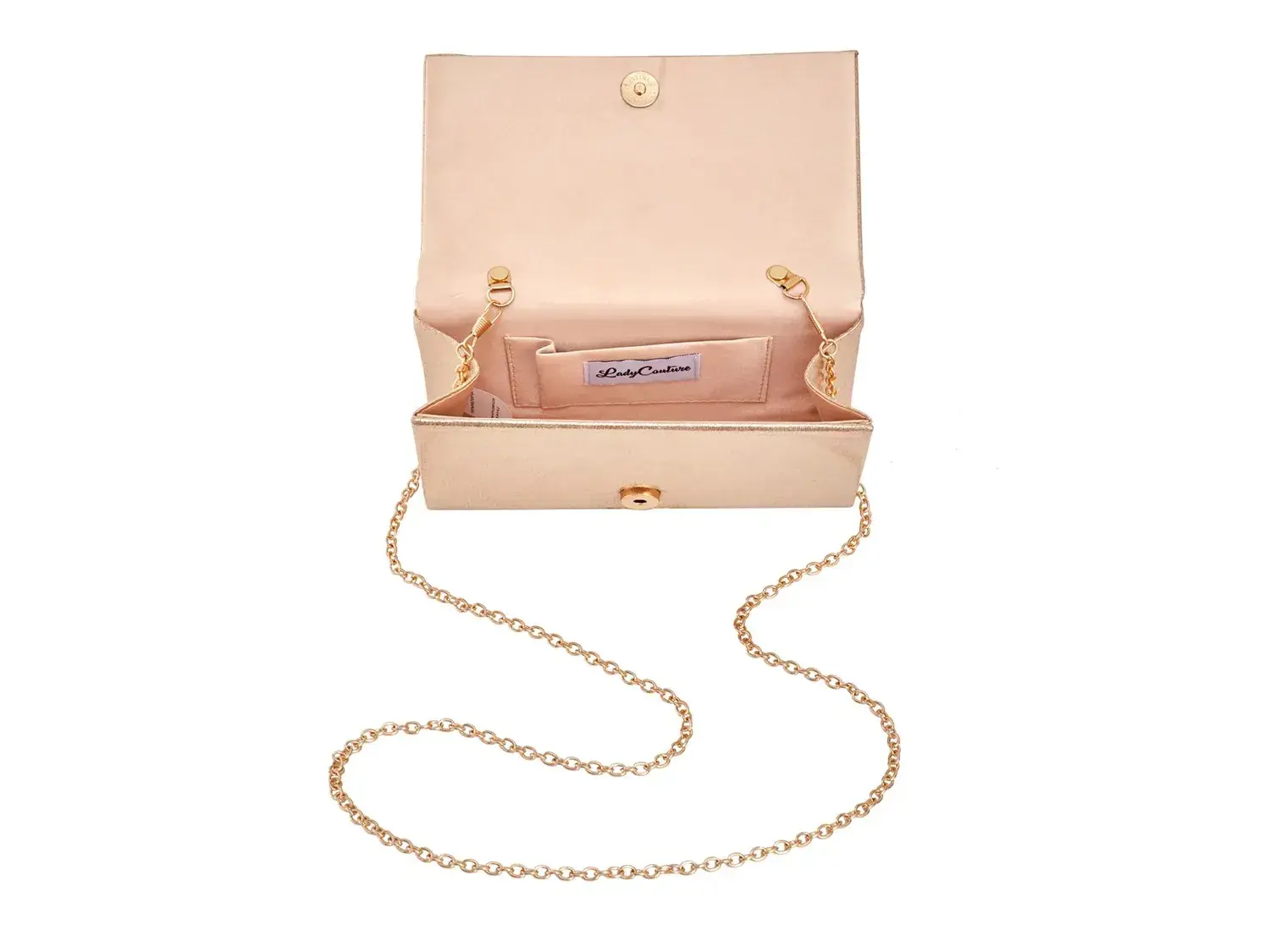 Добавьте блеска в любой наряд с помощью клатча Sue от Lady Couture. Атлас, украшенный стразами, добавляет блеска, а съемный ремешок-цепочка позволяет носить рок-боди!