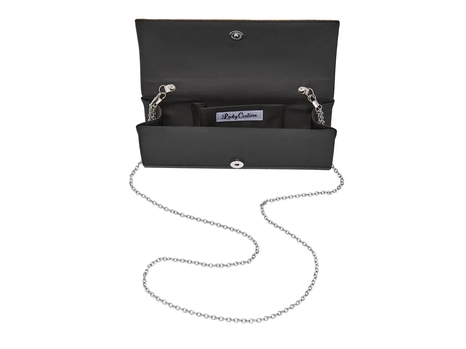 Клатч Tina от Lady Couture добавляет идеального блеска. Сатин, украшенный стразами, переливается со всех сторон, а съемный ремешок-цепочка позволяет играть как кроссбоди!