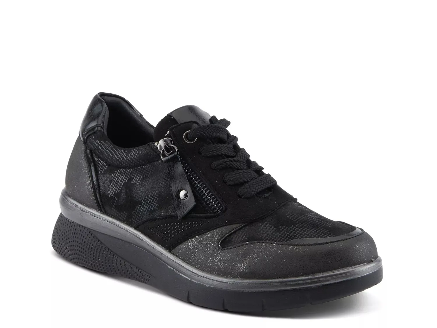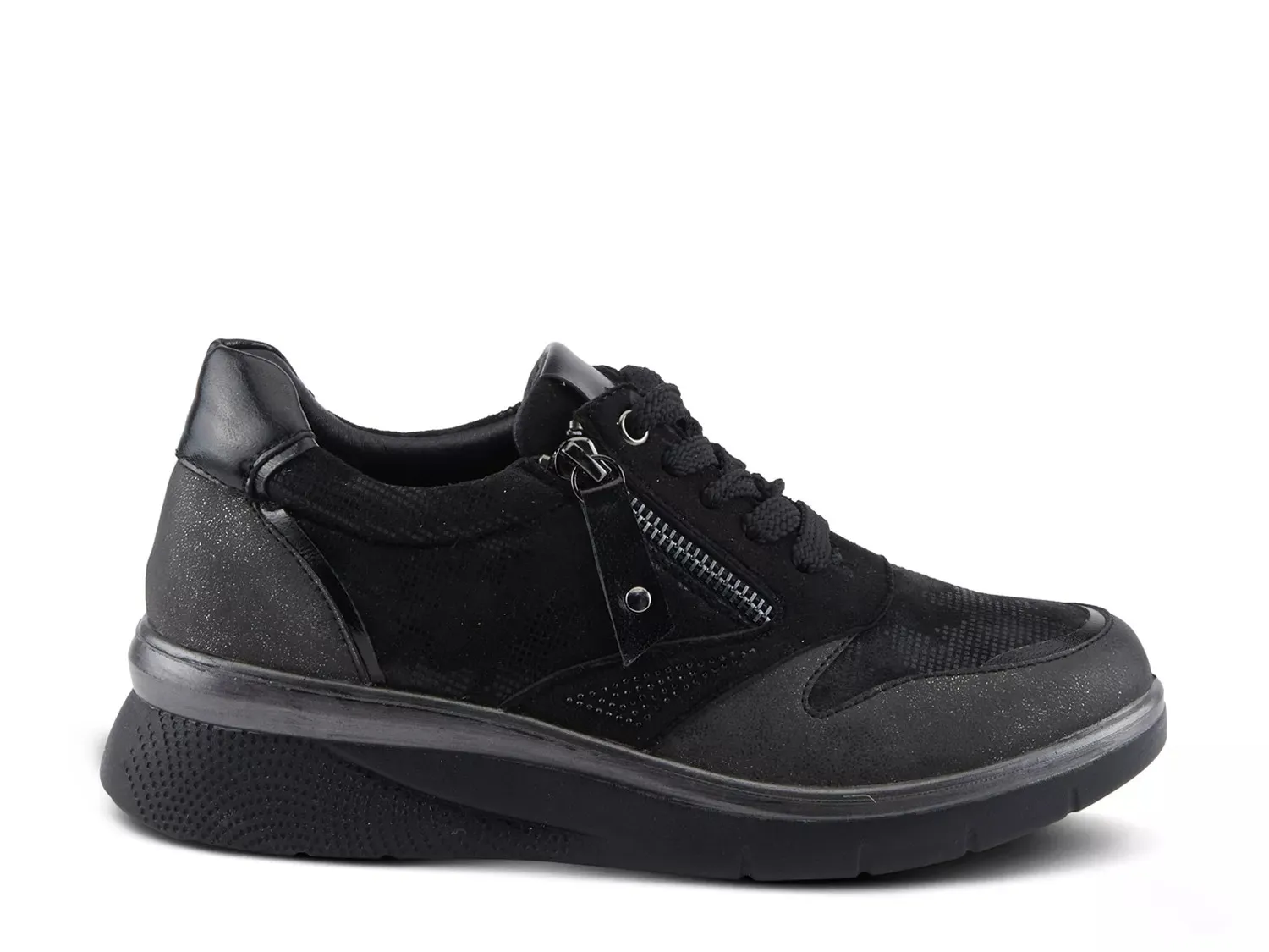 Сверкайте в спортивном силуэте с кроссовками Wyclef от Flexus от Spring Step. Эти кроссовки дополнены металлическим блеском, акцентами, покрытыми блестками, и деталями со стразами для мерцающего прикосновения. В комплекте с многослойным дизайном и туфлем на танкетке, которые превращают повседневную пару в модное дополнение.