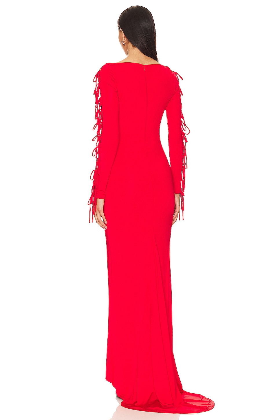 Заявите о себе на своем особом мероприятии в ярко-красном платье Simone от NBD. С шикарными вырезами на рукавах, обтягивающей трикотажной тканью и тянущимся шлейфом сзади это платье излучает элегантность и утонченность для незабываемого праздничного вечера.
