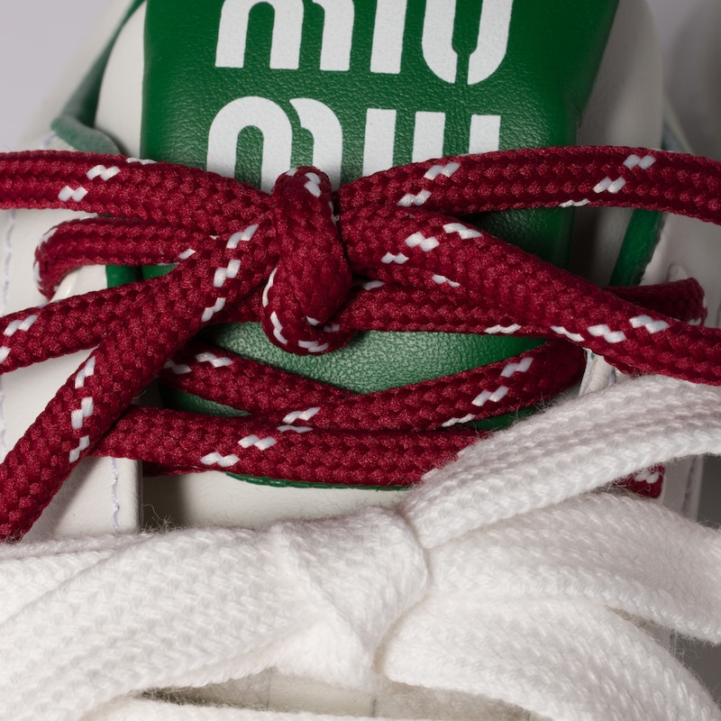 Эти кроссовки из телячьей кожи имеют спортивный и повседневный стиль благодаря двойной шнуровке и двухцветному шнурку, характерному для стиля Miu Miu.