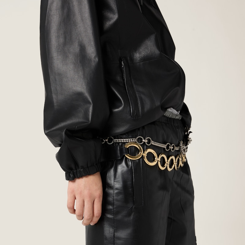 Эта куртка с капюшоном и свободными линиями изготовлена из кожи наппа, культового материала Miu Miu, с мягкой и легкой отделкой благодаря особому процессу тиснения.
