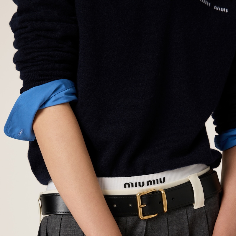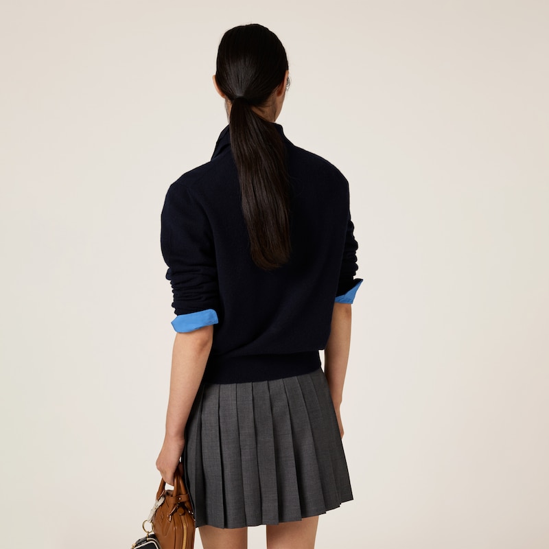 Эта рубашка поло, выполненная из мягкого, подчеркивающего фигуру кашемирового трикотажа, дополнена хлопковой деталью, вдохновленной мужским гардеробом, что добавляет современный штрих к классическому стилю Miu Miu.