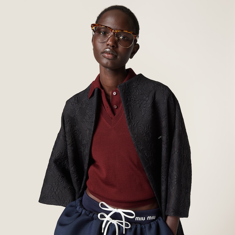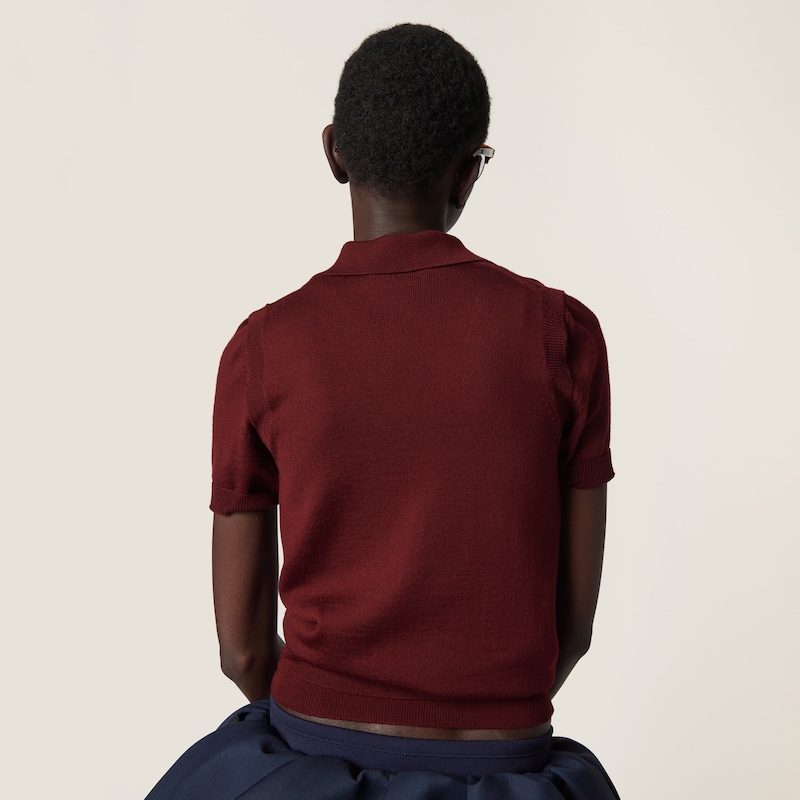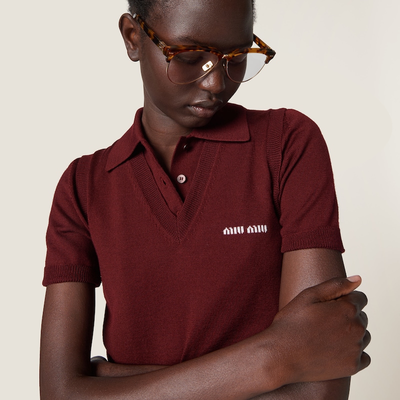 Знаменитый логотип Miu Miu выделяется на фоне мягкой текстуры шерстяной вязки этого изделия, которое отличается свободным силуэтом оверсайз.