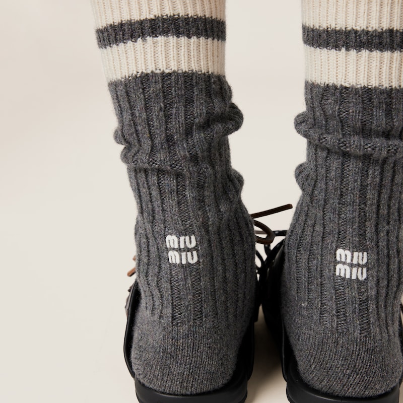 Эти мягкие на ощупь носки из шерсти и кашемира в рубчик украшены культовым логотипом Miu Miu.