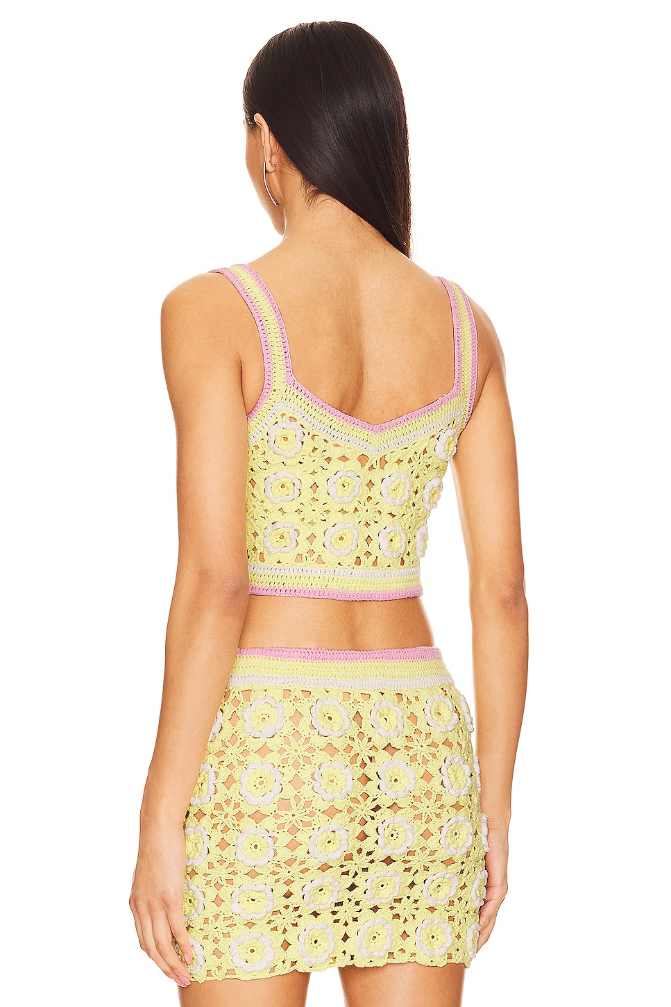 Lovers and Friends представляет Meadow Crochet Top в желтом цвете. Этот укороченный топ, выполненный из вязаной крючком ткани, дополнит идеальный весенний образ в сочетании с соответствующей юбкой