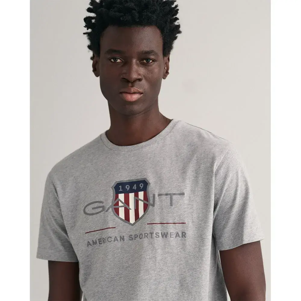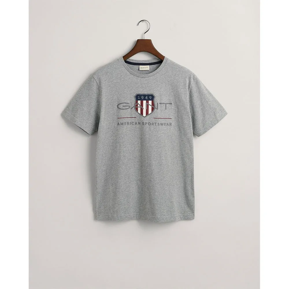 Идеальная повседневная вещь с короткими рукавами, классическим круглым вырезом и графическим принтом щита GANT в стиле 80-х годов на груди.