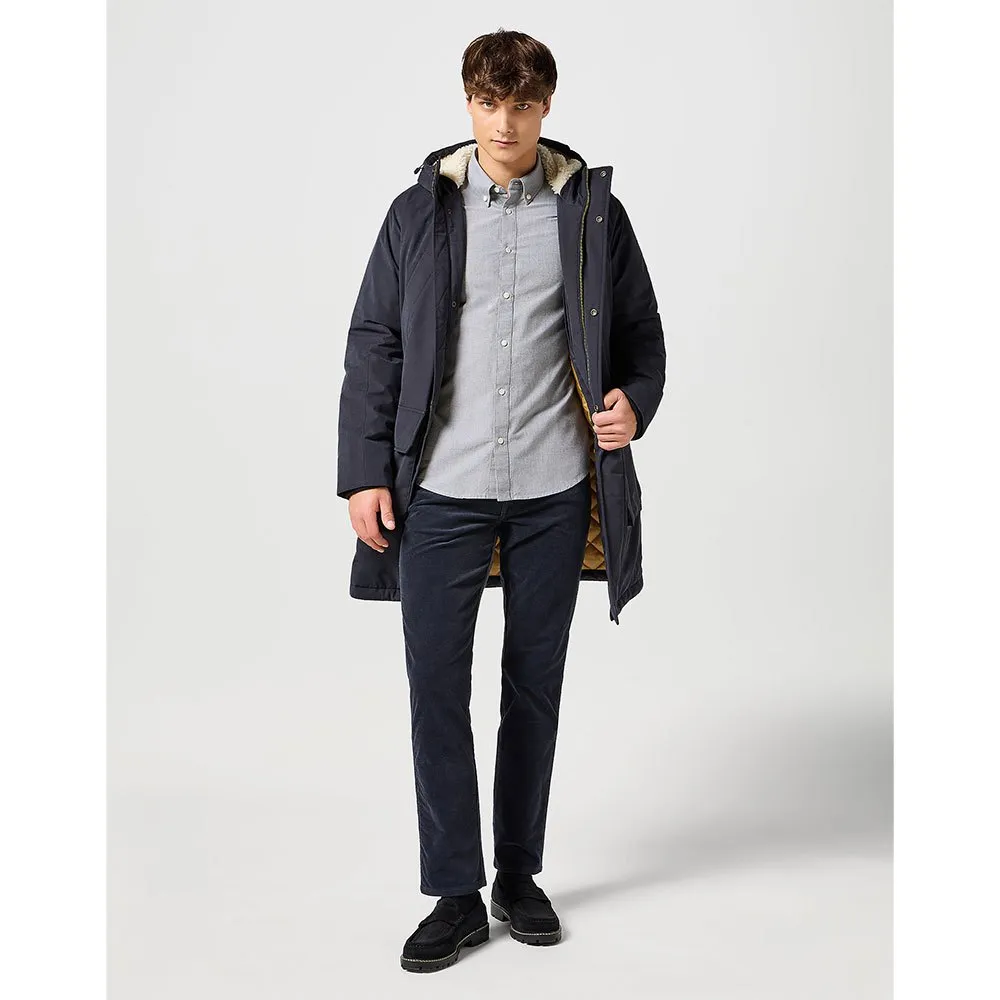 Особенности включают в себя изогнутый подол, воротник на пуговицах, вышитый логотип и манжеты на пуговицах.