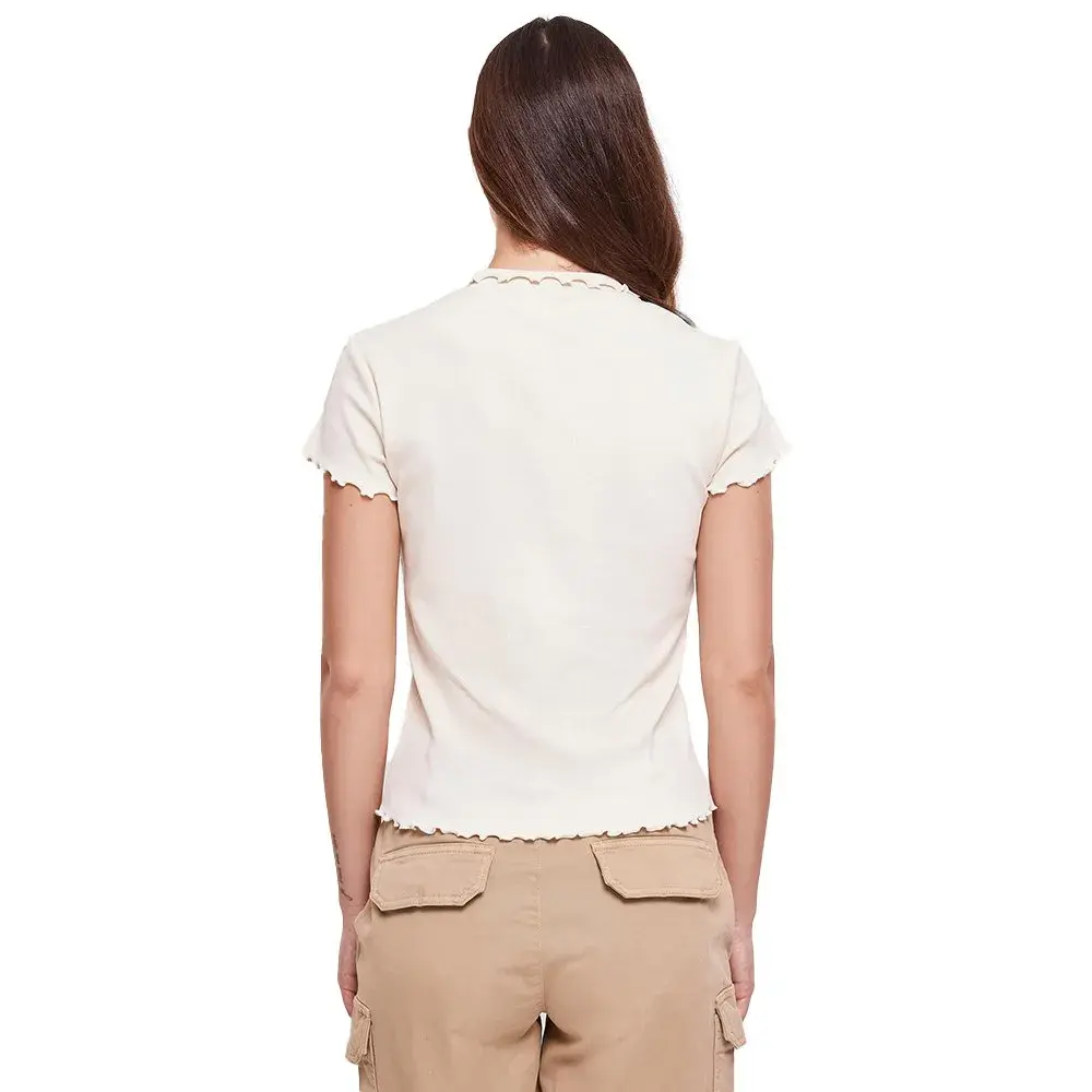 Этот симпатичный женский топ имеет оборки на воротнике-поло, подоле и рукавах.