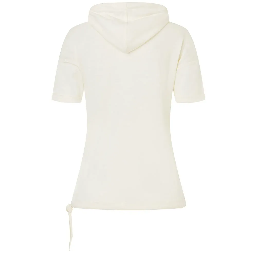 Короткий фасон с закатанными рукавами, капюшоном и манжетами на шнурках делает толстовку идеальным повседневным спутником.