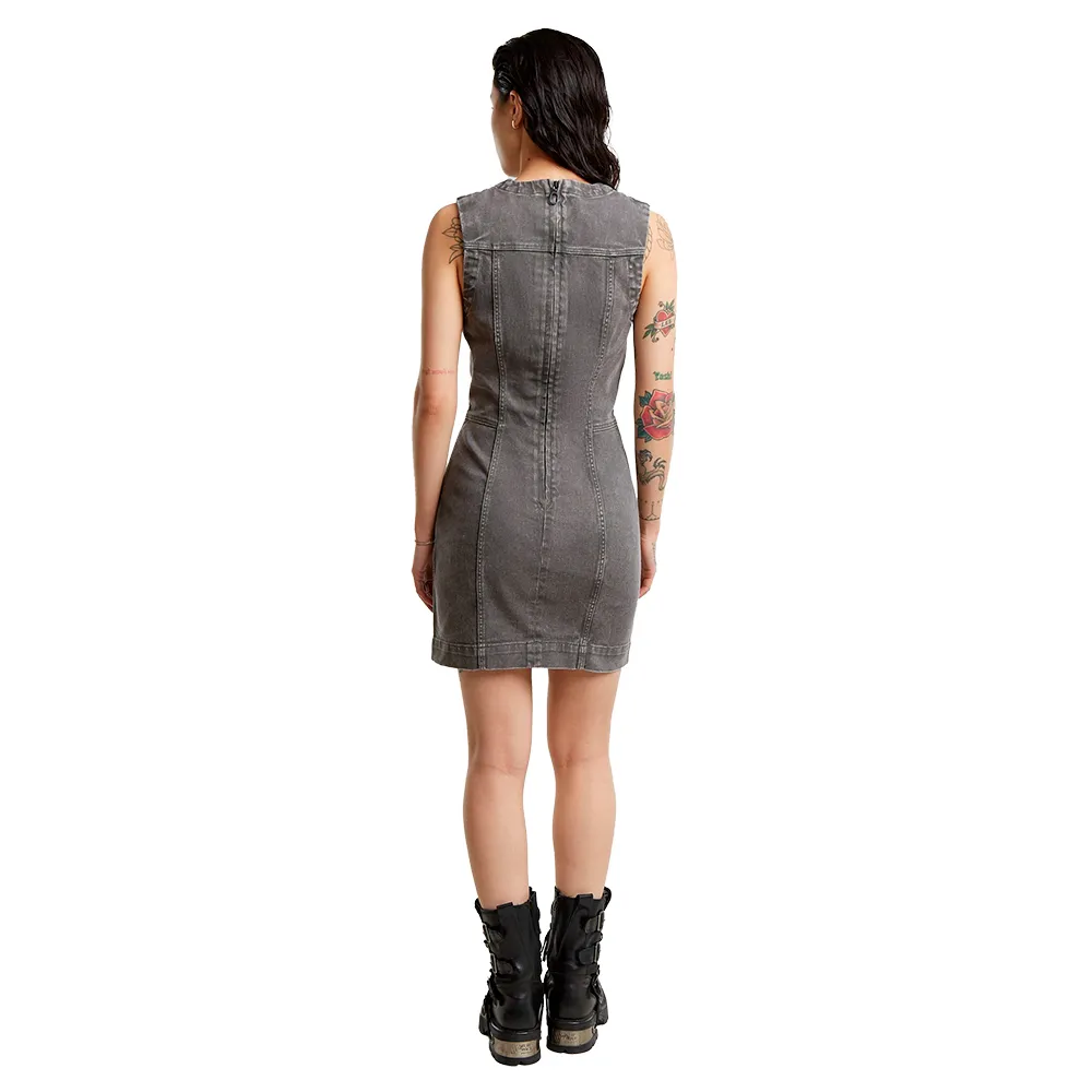 Это джинсовое платье имеет длину до верхней части штанины с застежкой-молнией сзади.