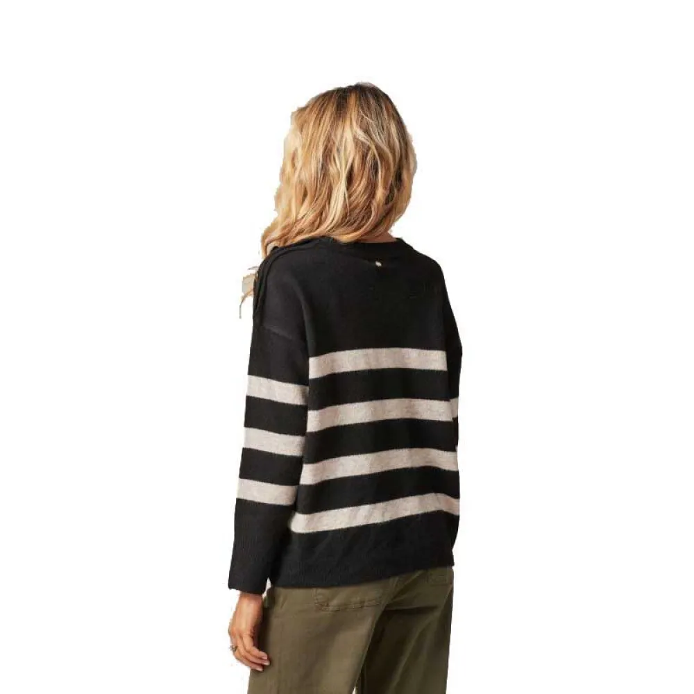 Этот свитер в стиле матросской рубашки выделяется своими изысканными деталями. Декоративные пуговицы на одном из плеч привносят нотку оригинальности и изысканности в эту вневременную модель. Круглый вырез подчеркивает ее классическую сторону.