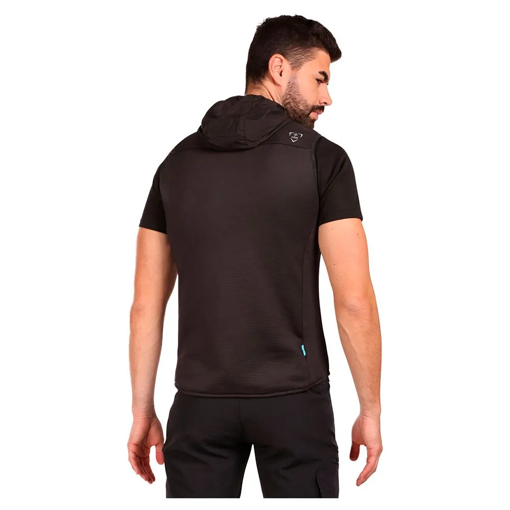 Жилет имеет капюшон с внутренней сетчатой подкладкой и высокий воротник, два кармана на молнии и нагрудный карман на молнии для мобильного телефона.