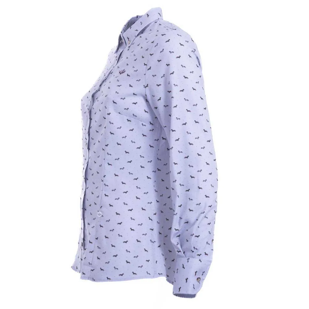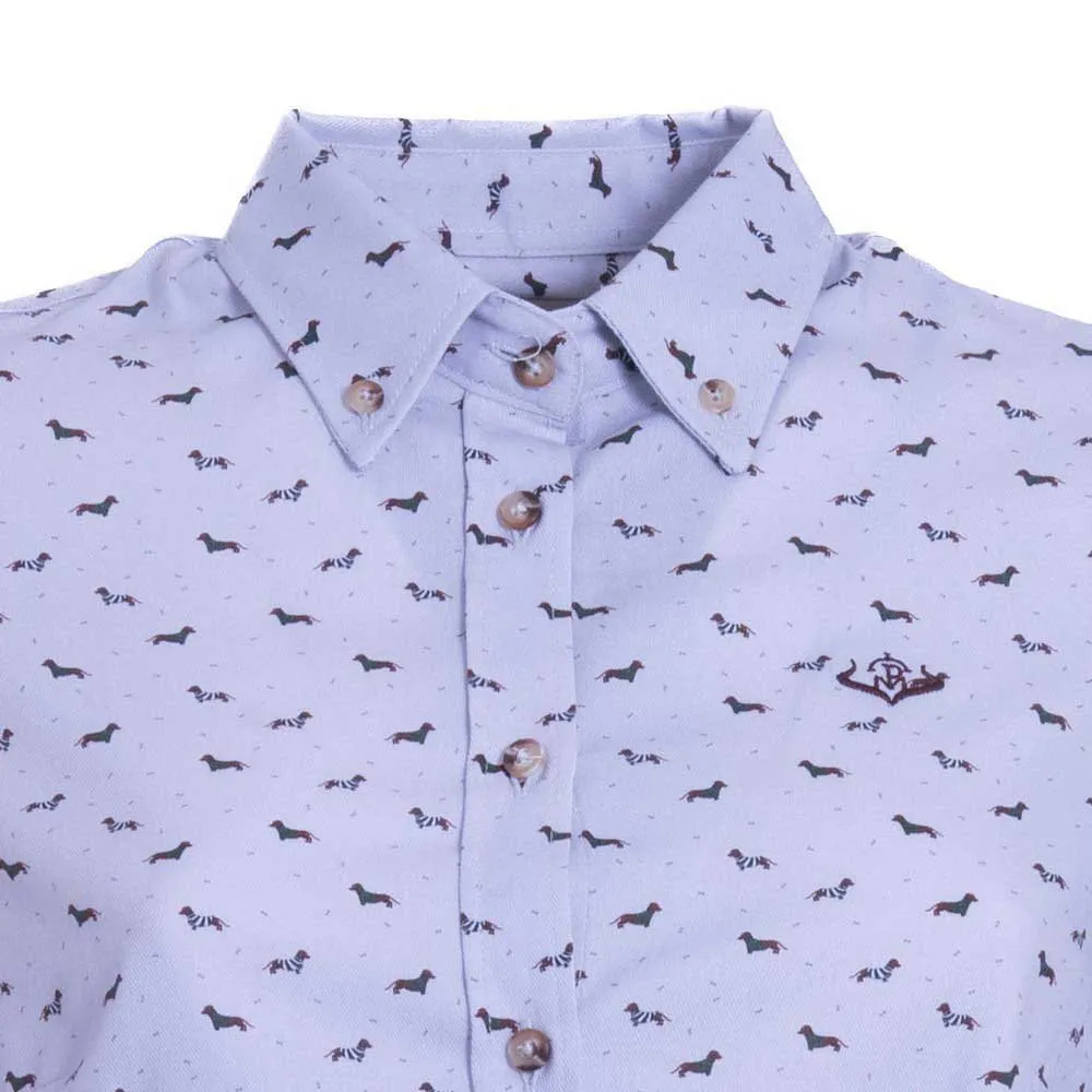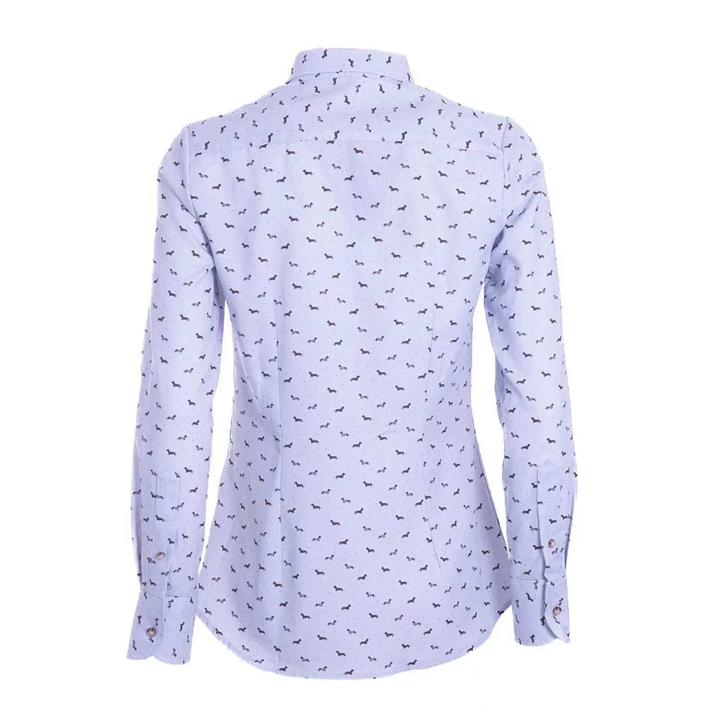 Женская охотничья рубашка с кремовым фоном с мотивами маленьких такс, две пуговицы на манжетах, воротник со скрытыми пуговицами.