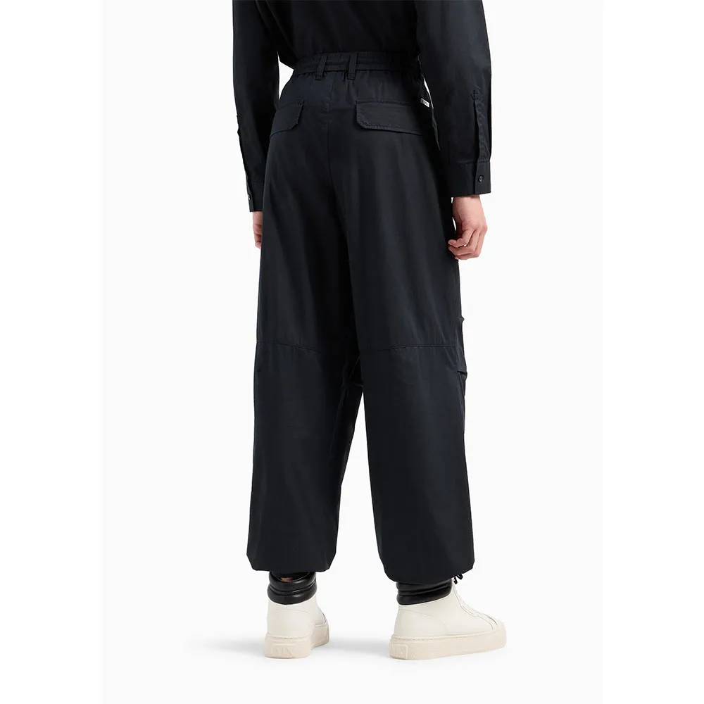 Широкие брюки-карго из хлопчатобумажной саржи, прорезные карманы, эргономичные вырезы на коленях, манжеты на завязках, карманы с клапанами и металлическая пластинка с логотипом сзади.