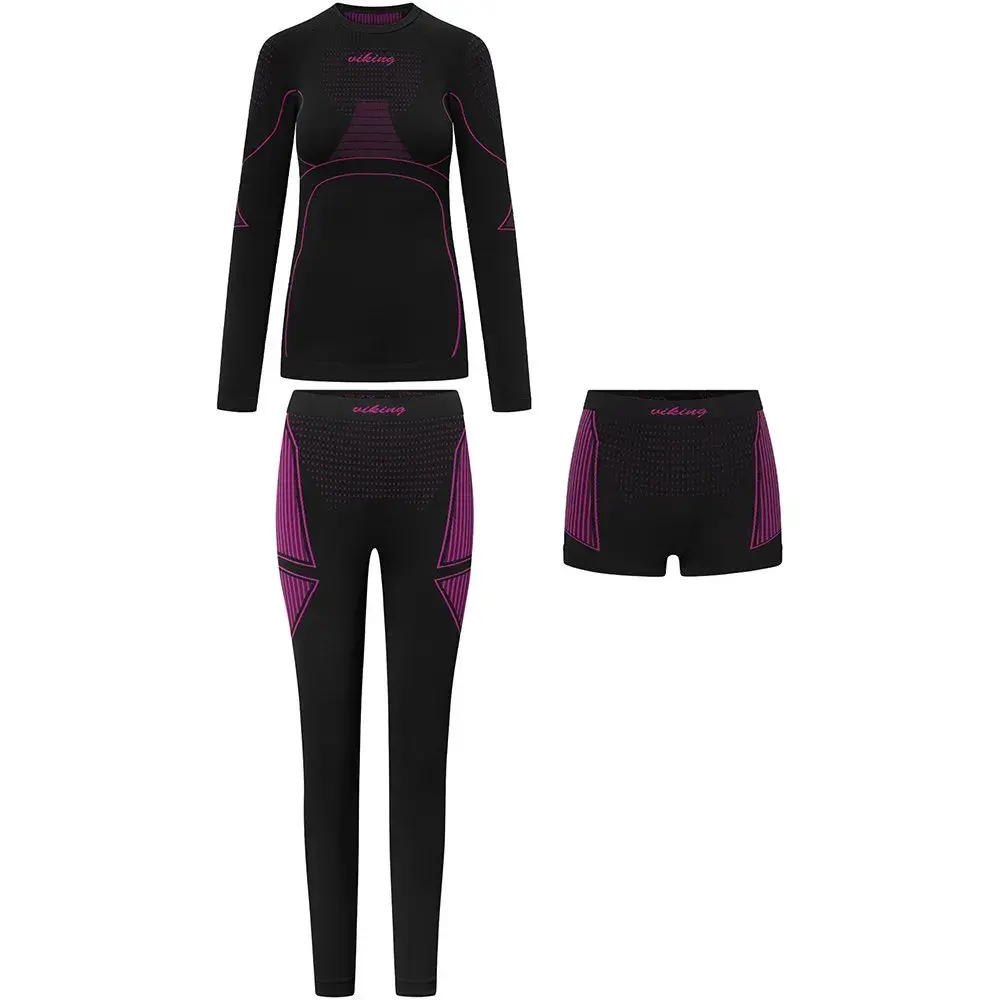 Viking Etna Set — модель женского термоактивного нижнего белья, идеально подходящего в качестве первого слоя одежды. Благодаря минимизации количества швов и эластичной и технической ткани комплект идеально облегает фигуру. Результат — комфорт и свобода движений, а также отсутствие потертостей и повреждений кожи при физической активности. Комплект нижнего белья разработан таким образом, чтобы пот и влага быстро выводились наружу и при этом сохранялся тепловой баланс, без перегрева или охлаждения тела. Состав трикотажного полотна (55% полиэстер / 37% полиамид / 8% эластан) помогает минимизировать запах, подстраиваться под структуру тела и согревать его. Дополнительным преимуществом нижнего белья Etna Set является его прочная упаковка, что облегчает хранение и демонстрацию товара.