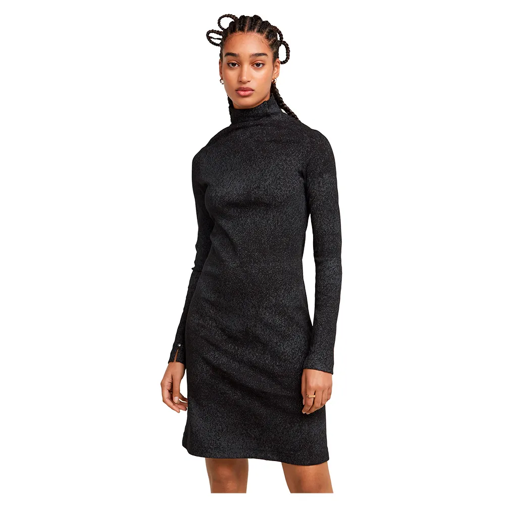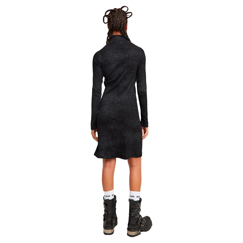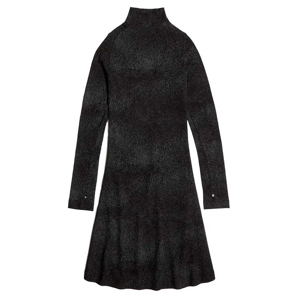 Платье Coated Rib имеет прямой крой. Ложный вырез горловины создается путем удлинения передней панели. Рукава реглан этого платья немного длиннее и имеют короткий разрез. Заклепка укрепляет угол. Общий графический принт добавляет характер.