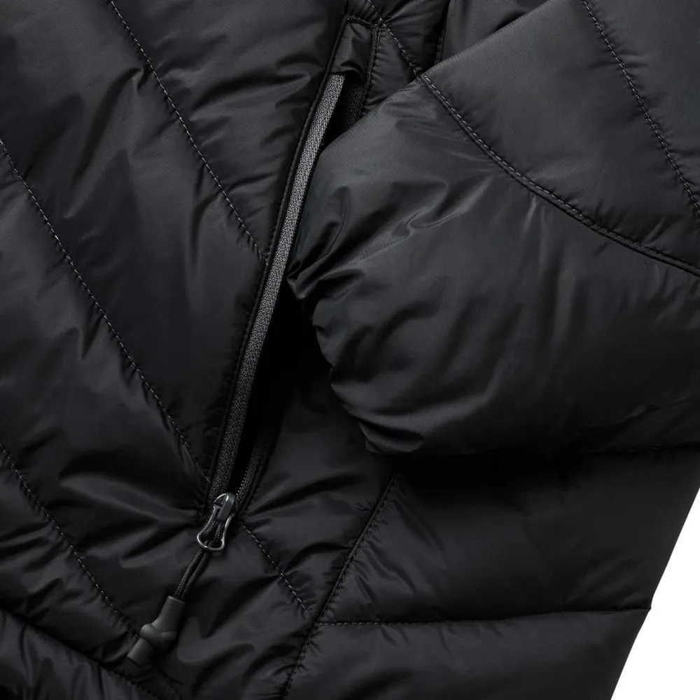 Утепленный капюшон обеспечивает дополнительную защиту от влаги и ветра, а регулируемый пояс на шнурке помогает сохранять больше тепла внутри при движении.