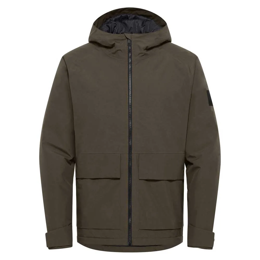 Детали современного стиля включают в себя фиксированный капюшон и 2 прорезных кармана на бедрах.