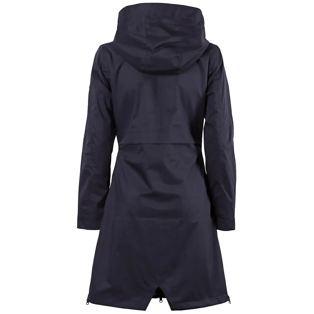 Водонепроницаемая длинная куртка с фиксированным капюшоном, двумя карманами с застежкой на кнопку, внутренним карманом на молнии, двухсторонней молнией и прорезями на молнии по бокам с тканевой вставкой.