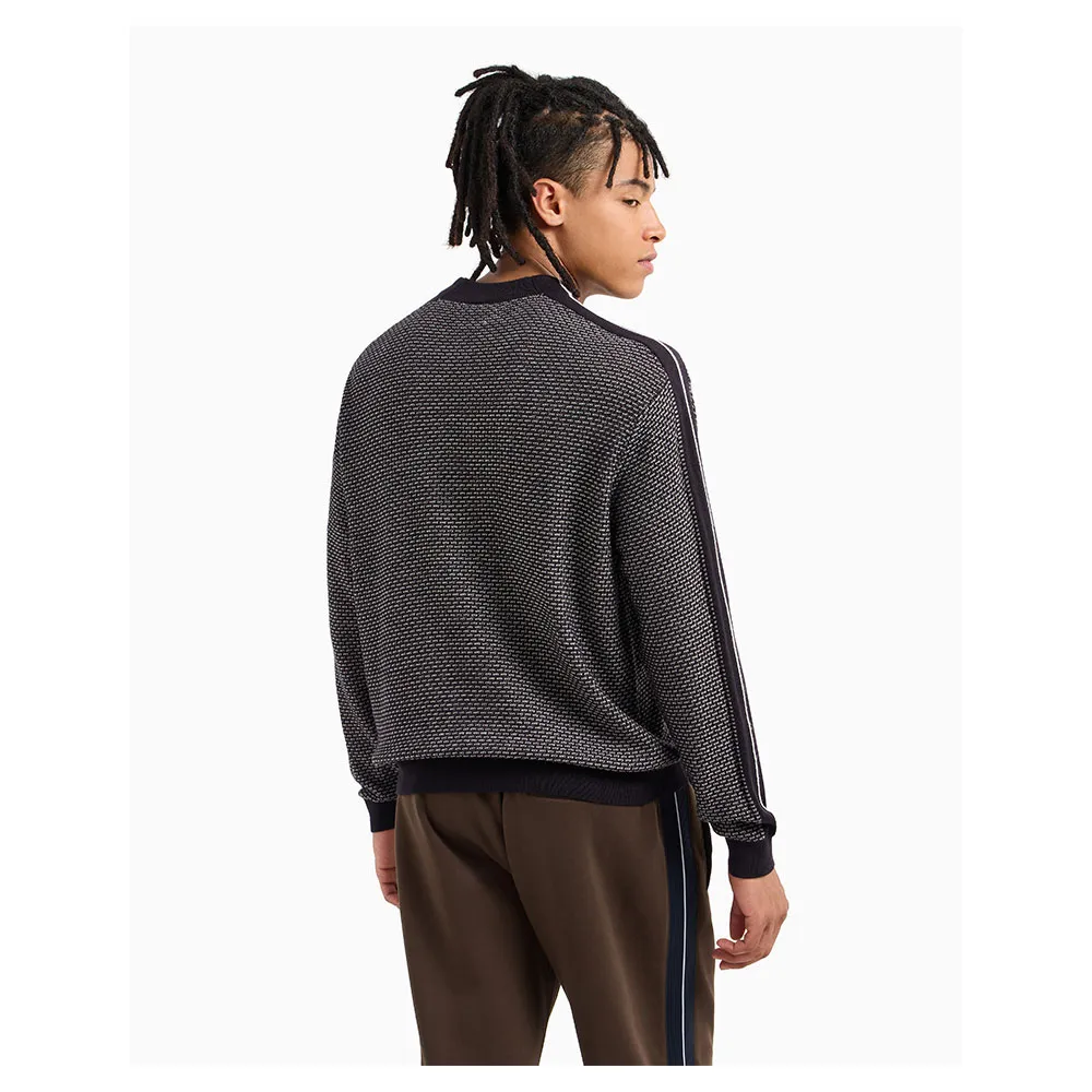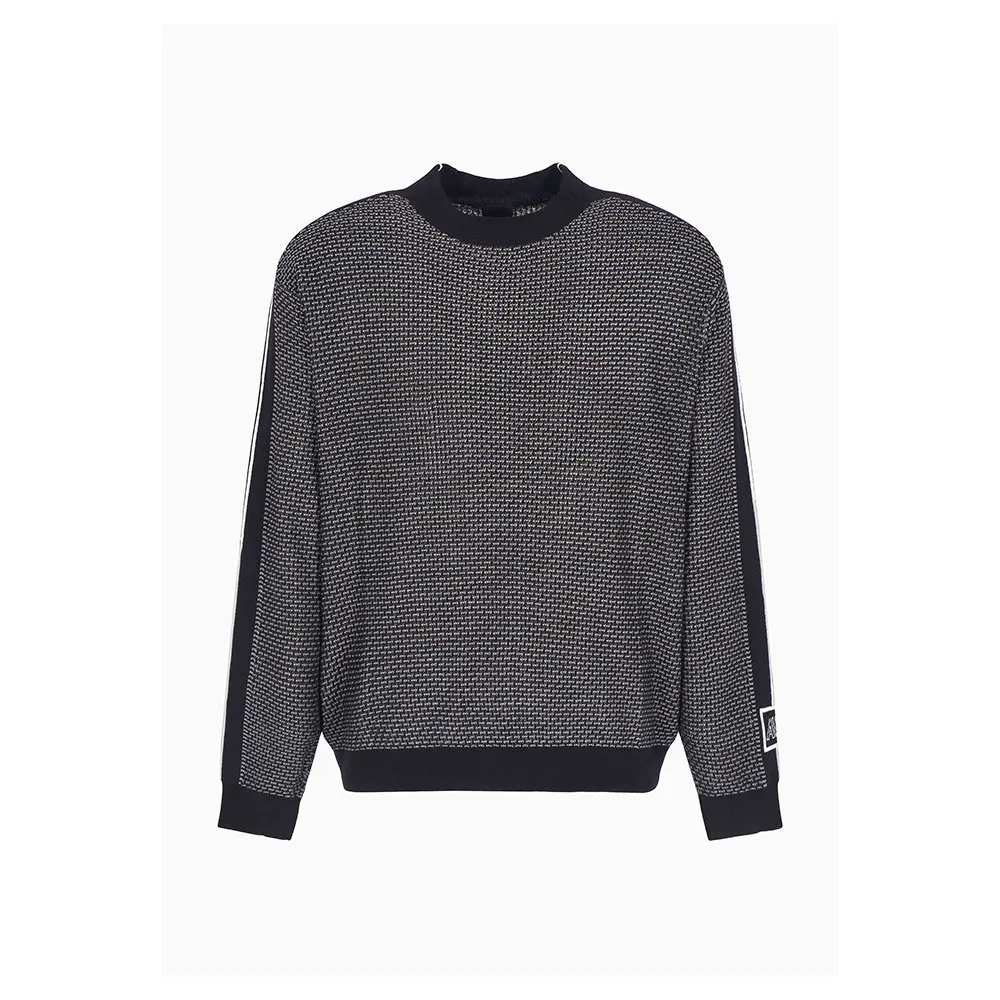 Свитер с круглым вырезом из смесовой шерсти 12 gg, трикотажная вязка, обратный трикотаж, соединительный шов, жаккардовая интарсия на рукавах.