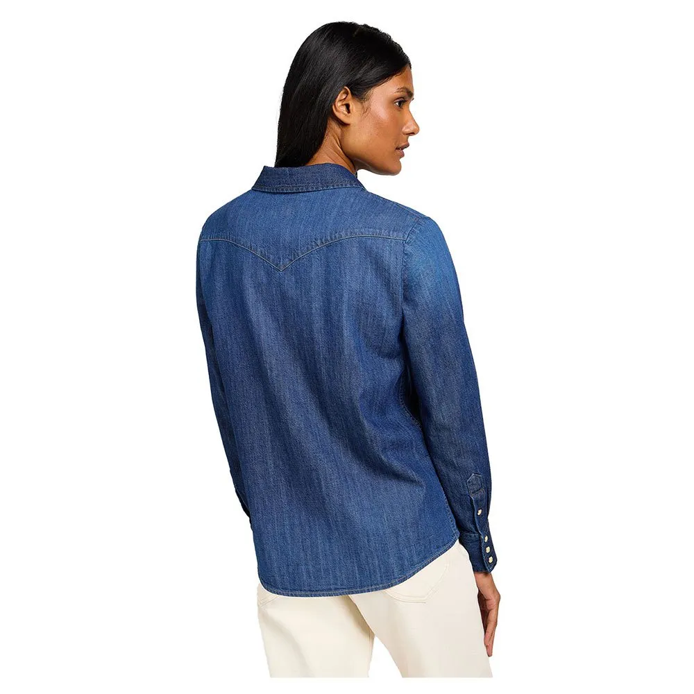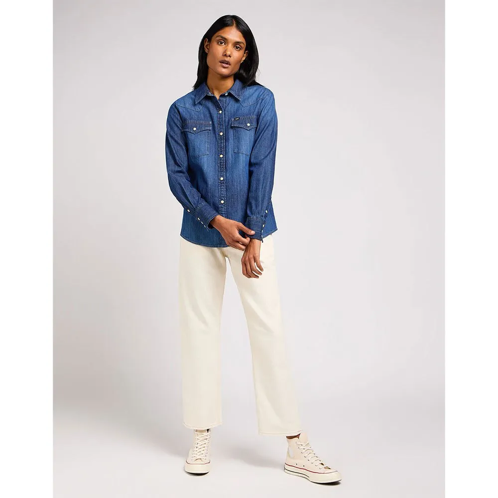 Все отличительные черты классической рубашки в стиле вестерн присутствуют здесь, включая застежки-кнопки, угловую кокетку и заостренные карманы с клапанами, все в силуэте обычного кроя. Этот деним изготовлен из не менее 70% регенерированного хлопка. Эта легкая ткань с аутентичной неэластичной ручкой и удобной для ношения. Это супертемный и насыщенный синий деним с едва заметными потертостями на теле. Застежки в стиле перламутра и тканый логотип Lee отличают эту классическую рубашку.