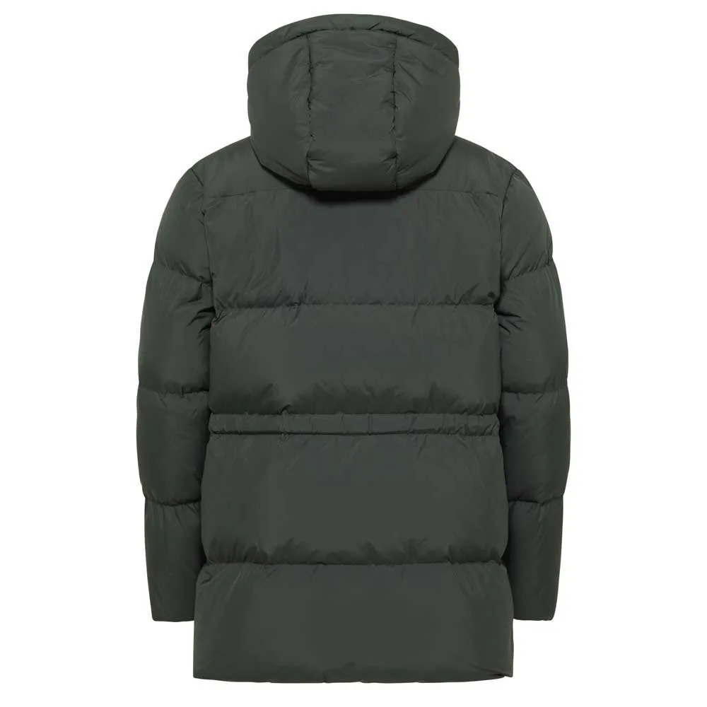 Пуховое пальто с водонепроницаемым верхом и современным стилем.