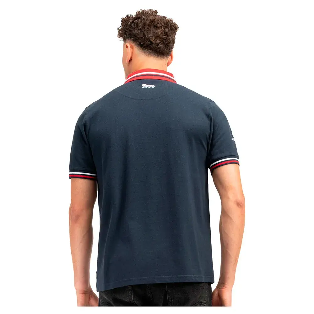 Рубашка поло с двумя разноцветными полосками на воротнике и манжетах. Нижняя часть воротника также противоположного цвета, а внутренняя панель пуговиц также контрастирует с внешней тканью. На левой груди и шее имеются различные вышитые логотипы. Еще одной визуальной изюминкой является сочетание нашивки с изображением британского флага и вышитой надписи на правом рукаве.