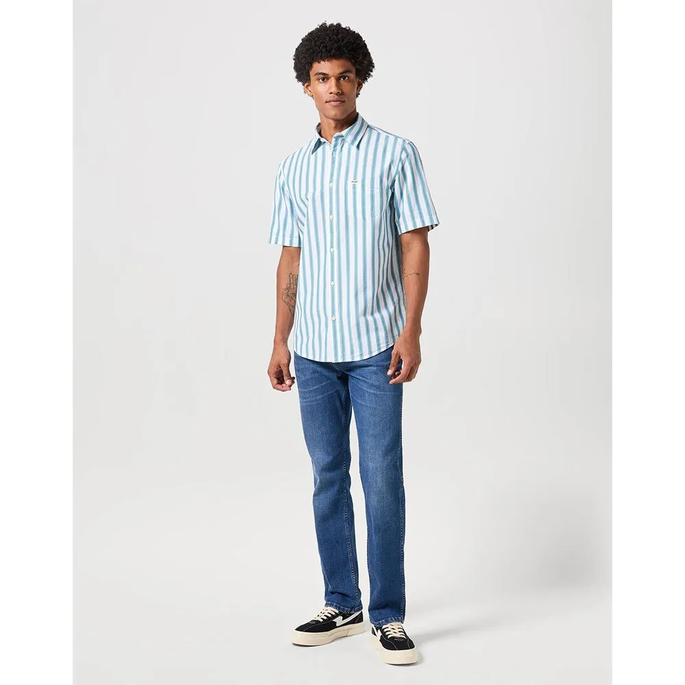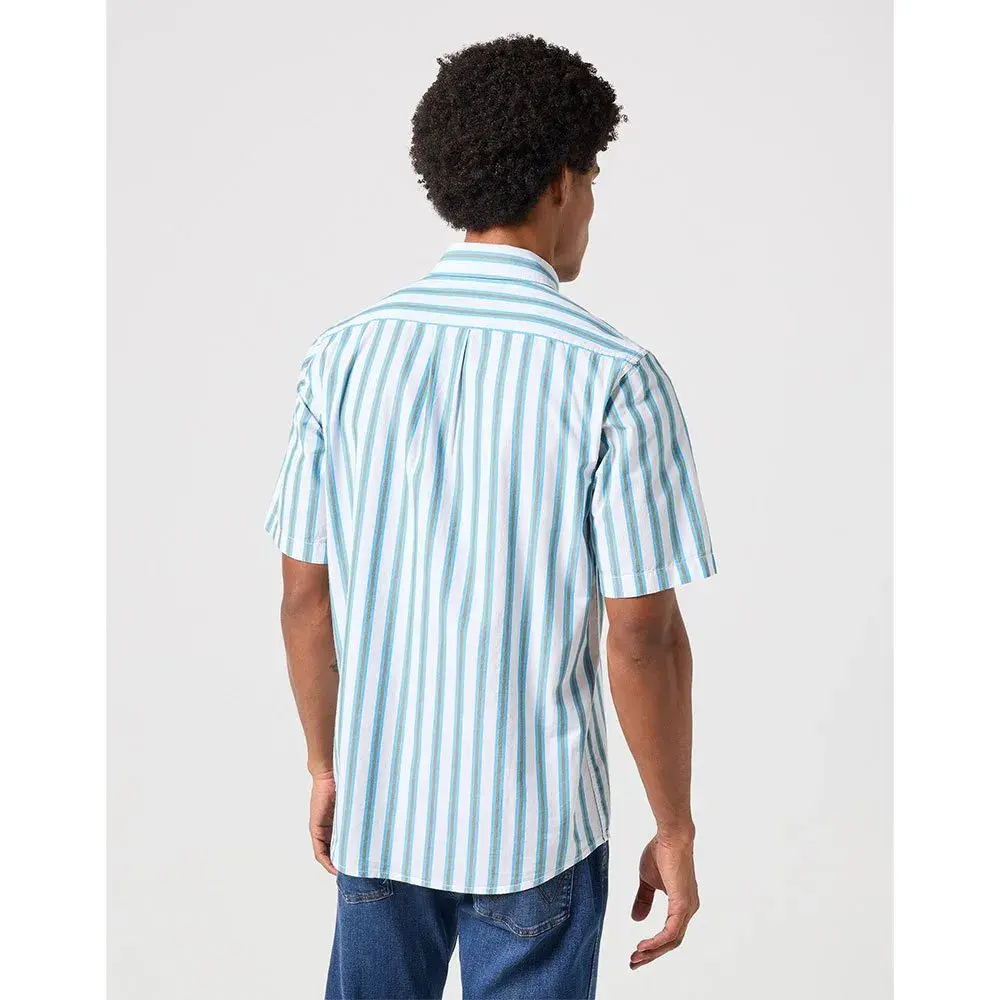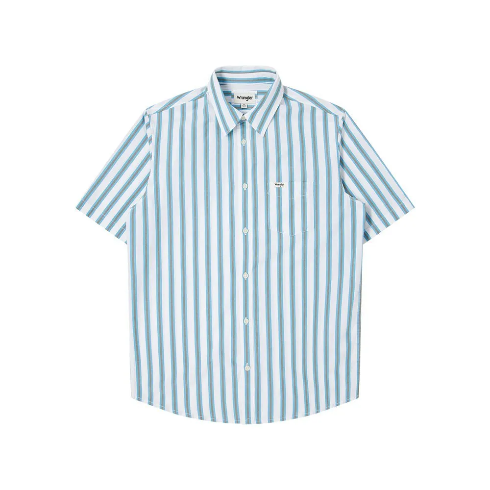 Рубашка с коротким рукавом и одним карманом — это базовая модель, выполненная на свежей белой основе с акцентом на светло-голубых вертикальных полосках.