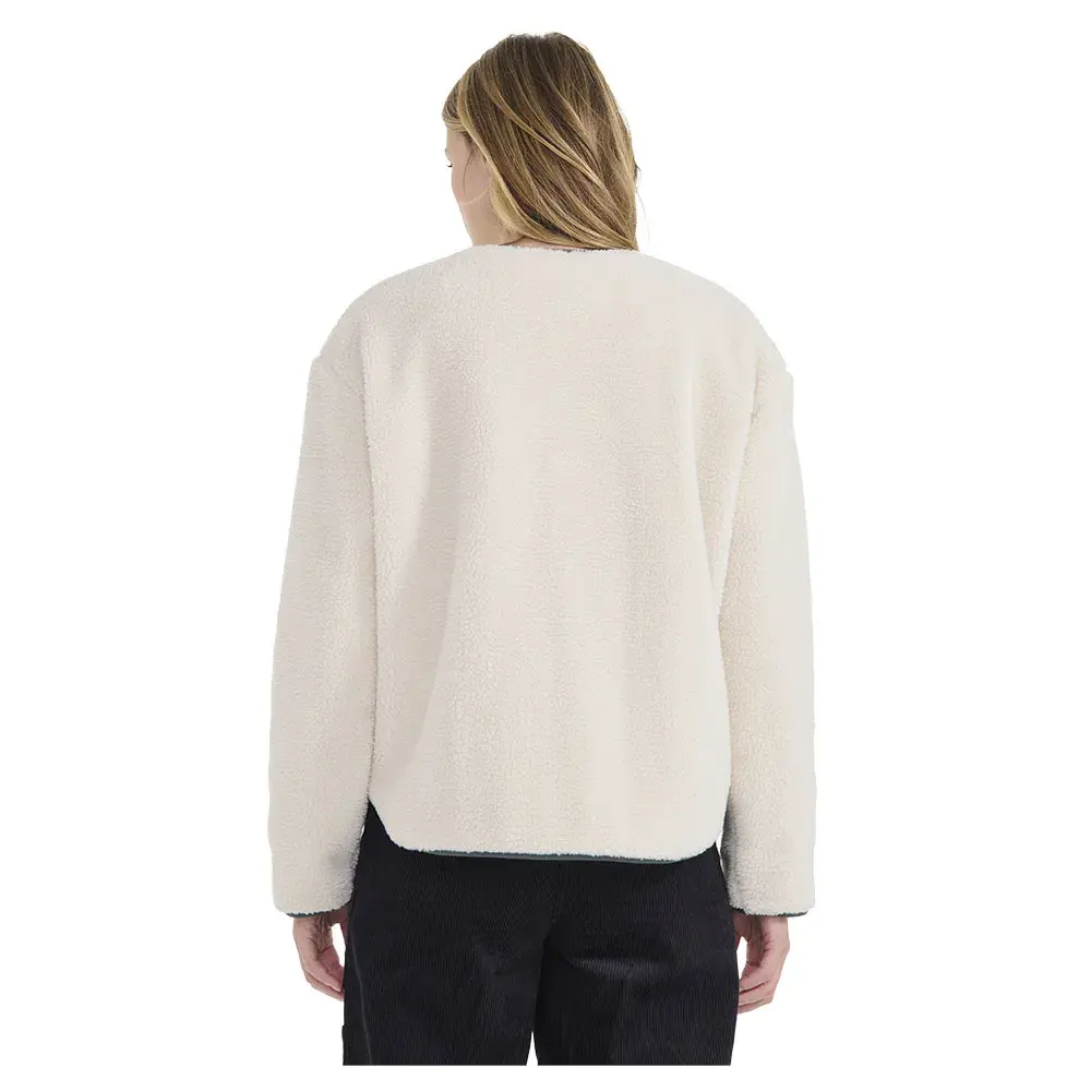 Одну сторону можно носить как куртку из шерпы с контрастной планкой на пуговицах, а другую можно носить как элегантную стеганую куртку.