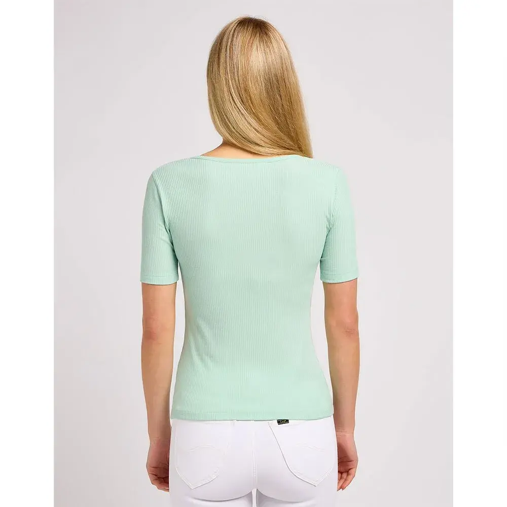 Эта облегающая футболка с широким V-образным вырезом, который сочетается с узкой планкой с четырьмя пуговицами, выгодно подчеркивает ваш силуэт. Идеально подходит для лета или в сочетании с многослойным образом. Ткань изготовлена из эластичного ребристого материала с высоким процентом эластичности, чтобы она плотно прилегала к коже. Цвет яркий, живой зеленый с естественным блеском.