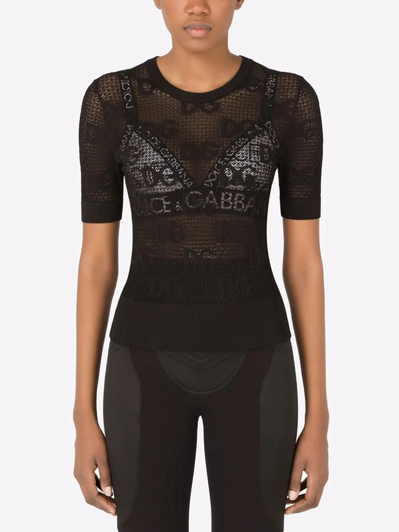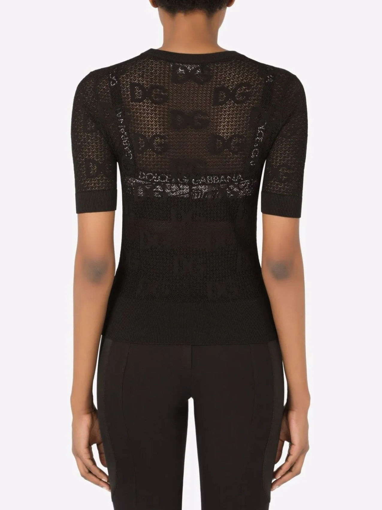 Жаккардовый логотип, прямой подол, круглый вырез и короткие рукава. Цвет: черный.