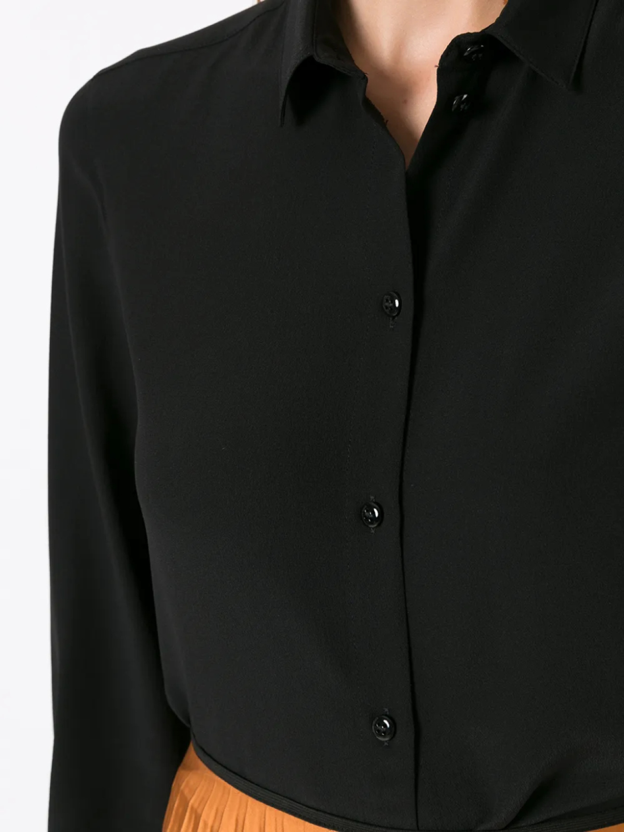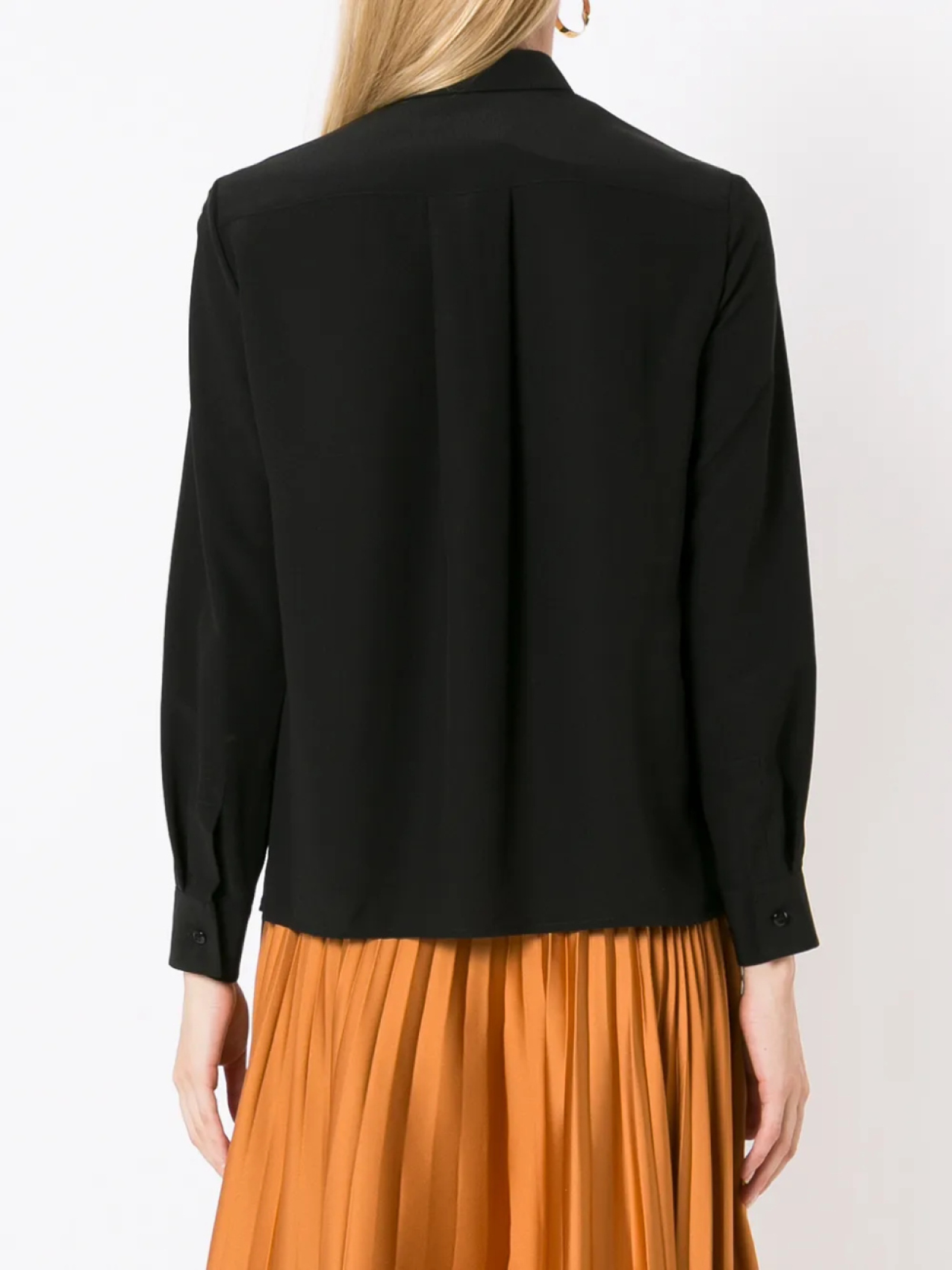 Классический воротник, застежка на пуговицах спереди, длинные рукава, манжеты на пуговицах и прямой подол.