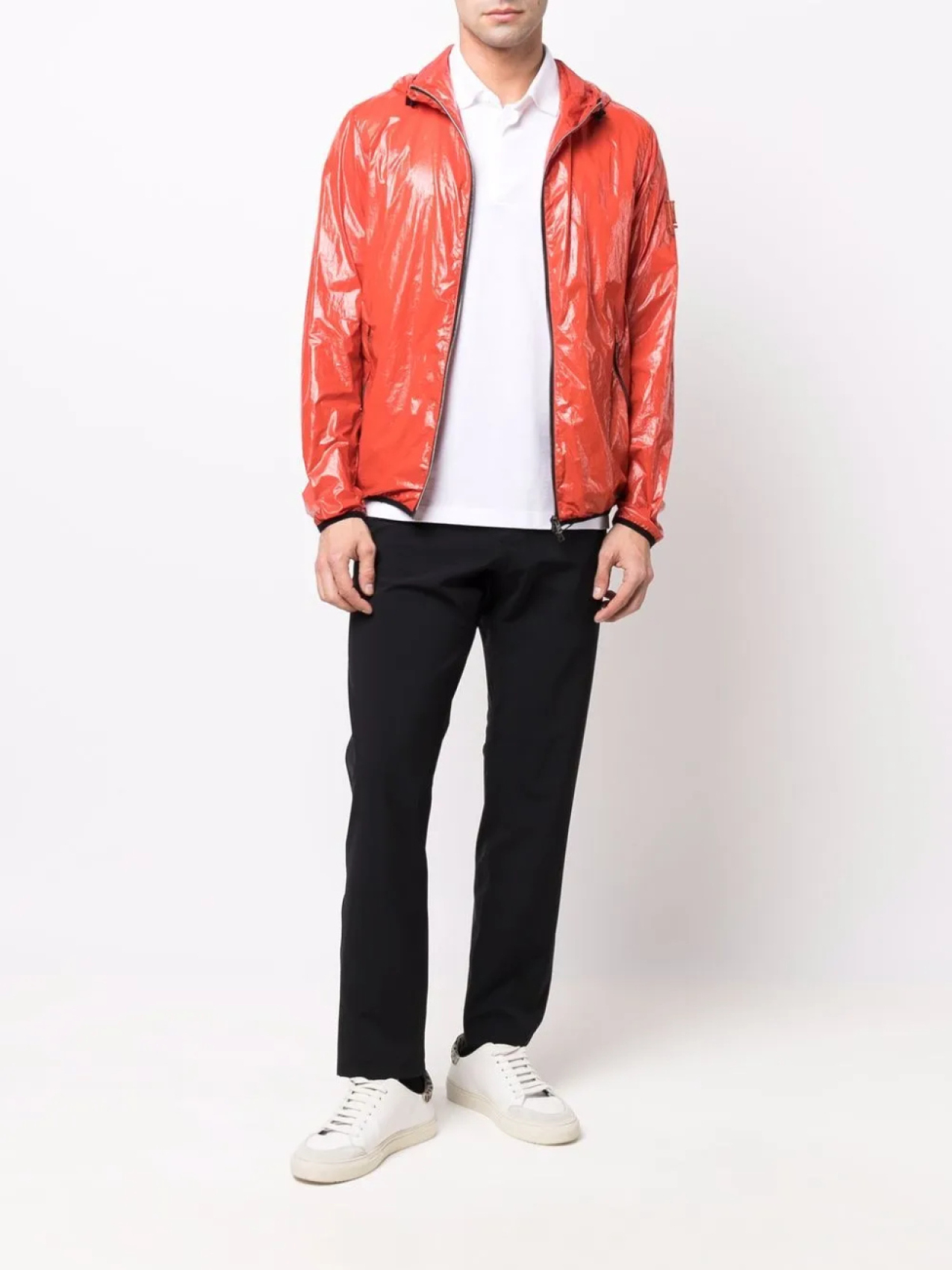 Глянцевая фактура, нашивка с логотипом на рукаве, застежка на молнии спереди и классический капюшон. Цвет: красный.