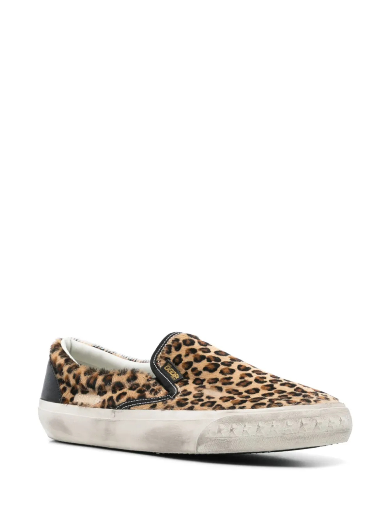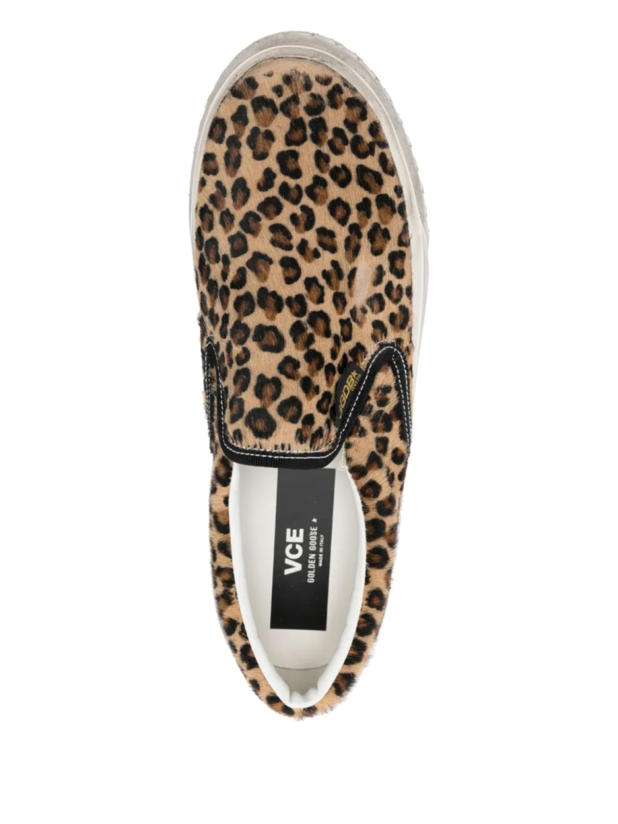 Светло-бежевая плоская резиновая подошва, контрастный фирменный задник, бирка с логотипом и леопардовым принтом
