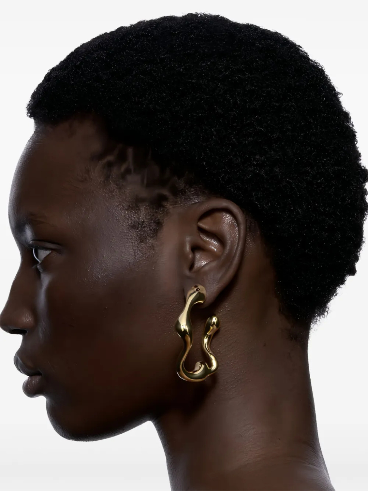 Застежка-кольцо золотистого оттенка, рельефный дизайн, гравированный логотип. Это одиночная серьга.