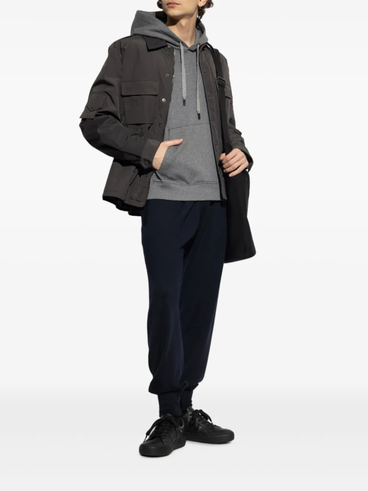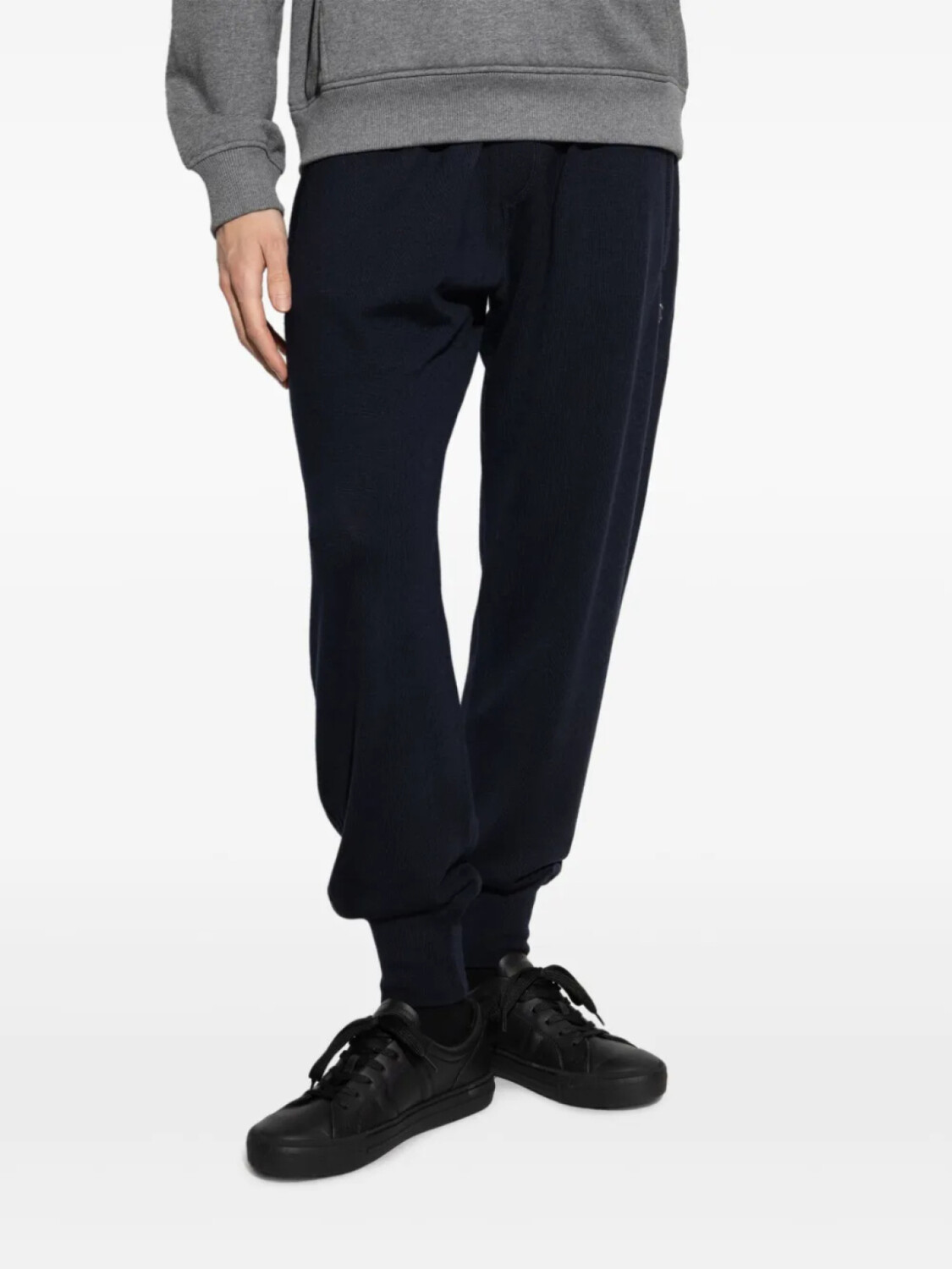 Эластичный пояс глубокого темно-синего цвета, регулируемые шнурки, боковые карманы на молнии, ребристые манжеты, вышитый логотип, свободный крой