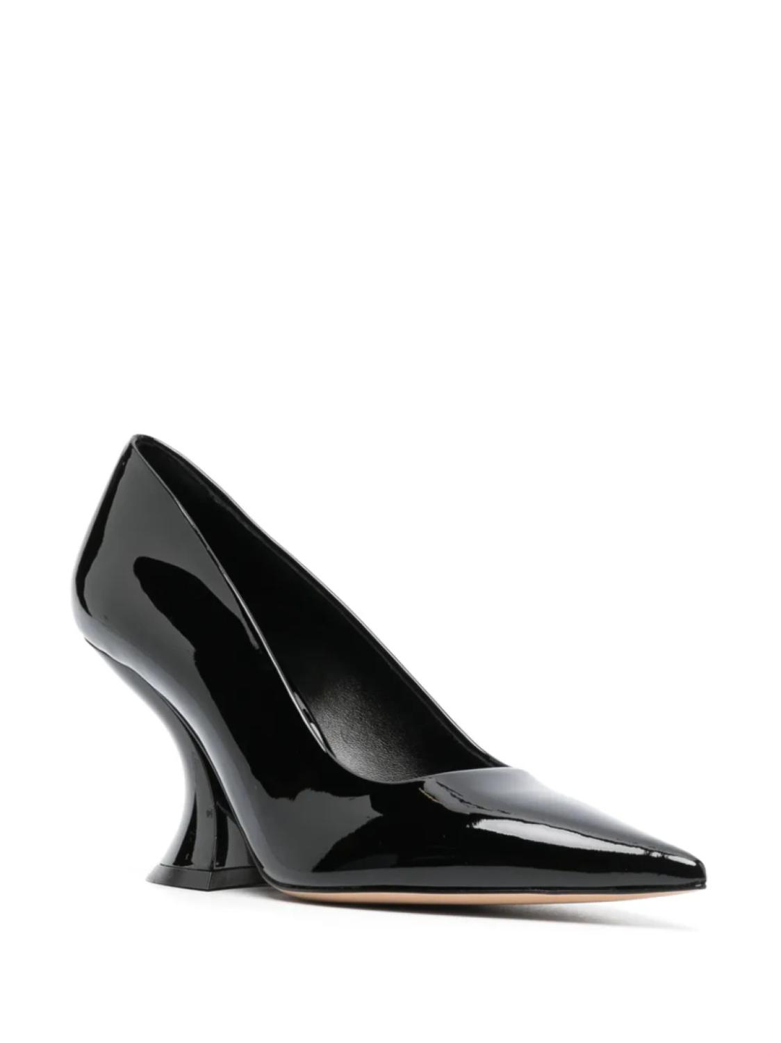 Черный, телячья кожа, лакированная отделка, кожаная стелька с логотипом, модель без застежки, заостренный носок и высокий скульптурный каблук.