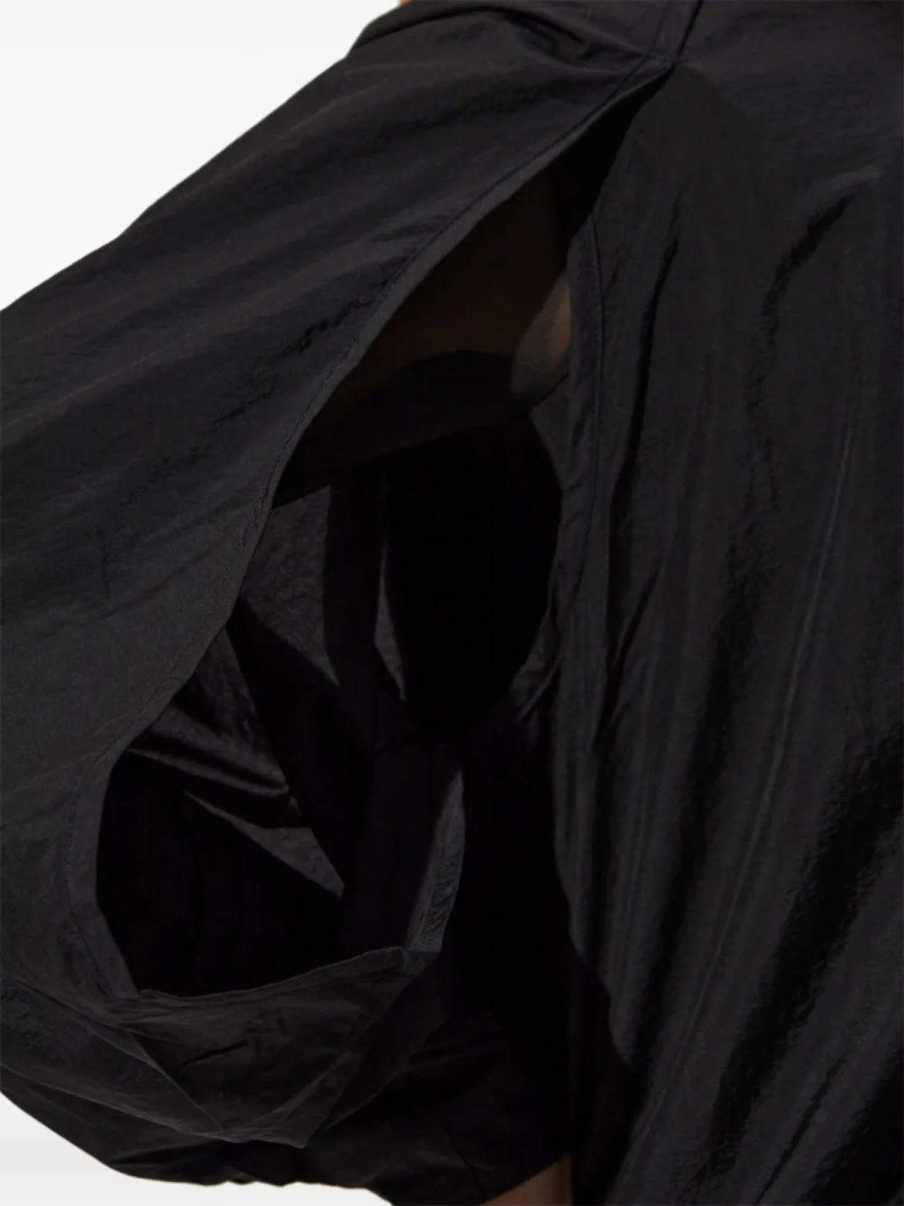 Черный, легкий дизайн, застежка-молния спереди, высокий воротник, слегка спущенные плечи, удлиненные рукава, эластичные манжеты, эластичный подол, минималистичный стиль, тональная отделка логотипом