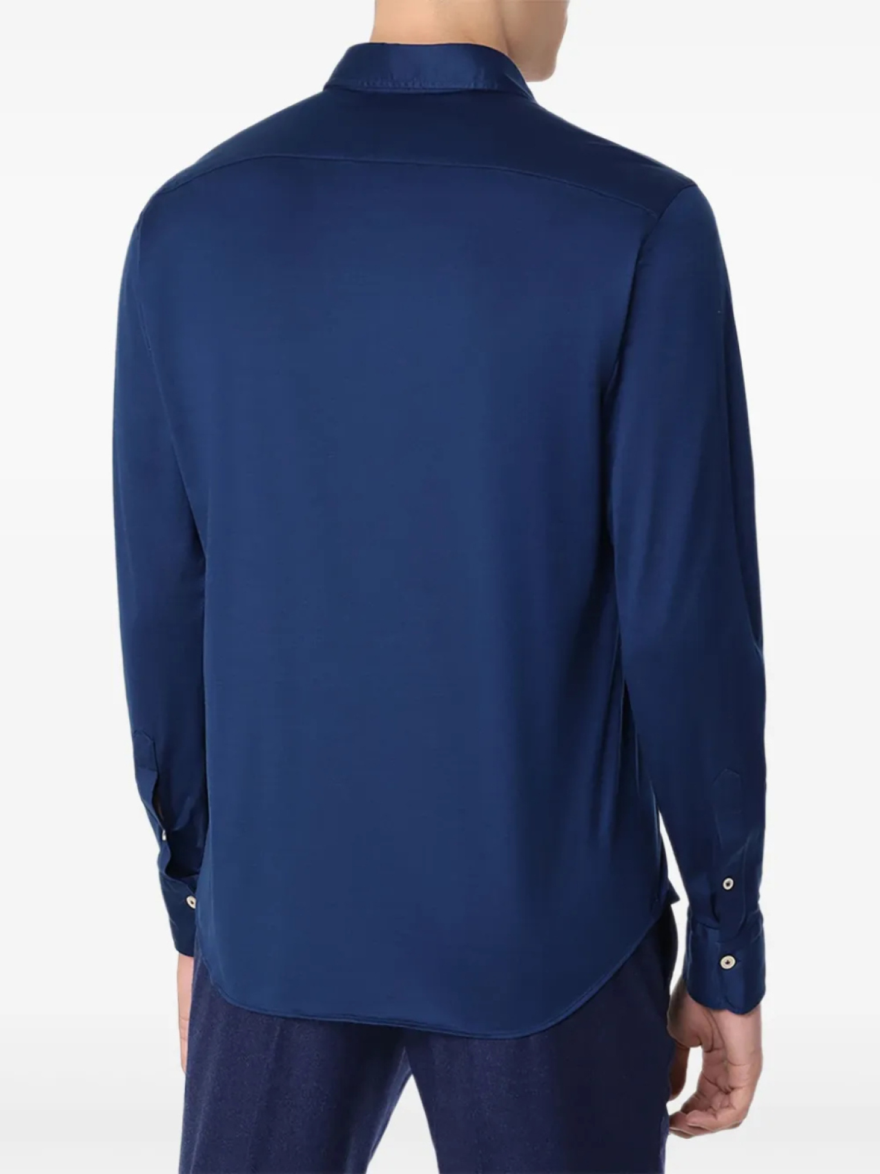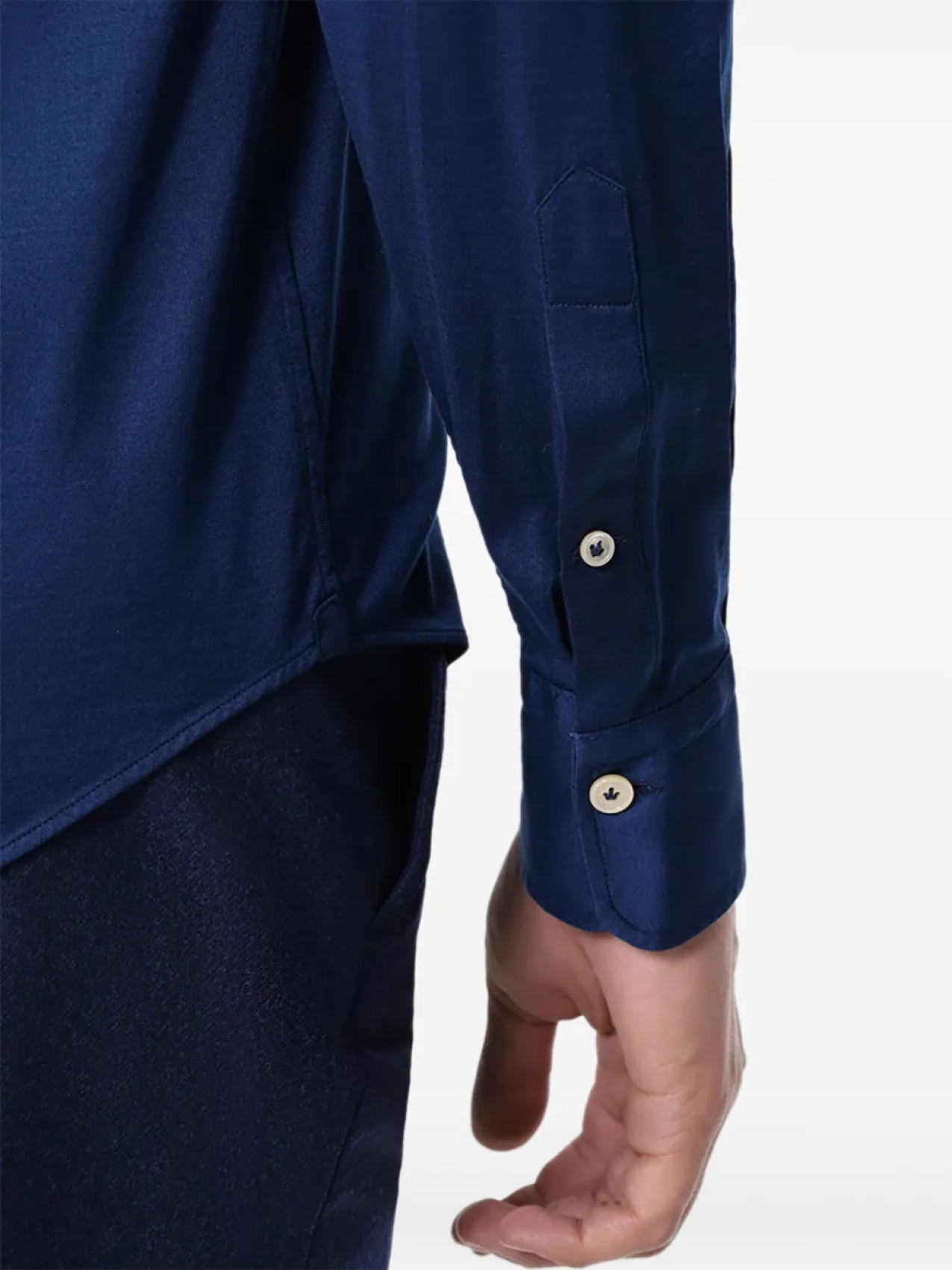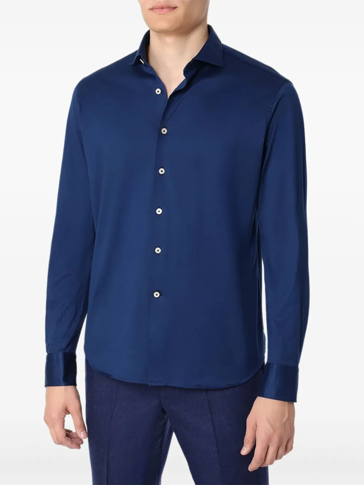 Темно-синяя застежка на пуговицы спереди, длинные рукава, застегивающиеся на пуговицы манжеты, закругленный подол